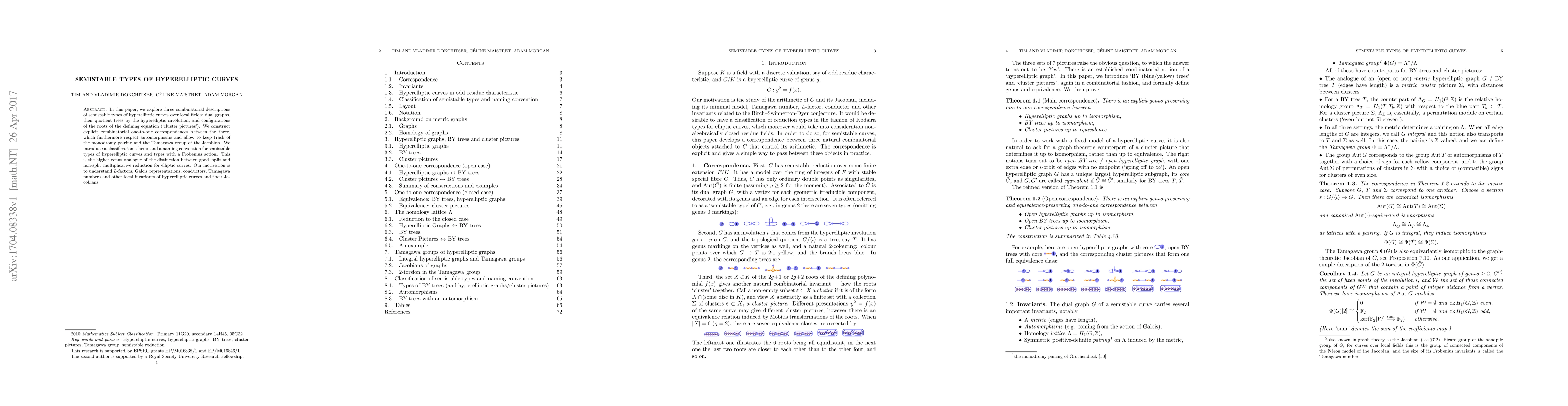 This paper investigates three combinatorial descriptions of semistable types for hyperelliptic curves over local fields, establishing correspondences between dual graphs, quotient trees, and root configurations. It aims to classify these types and explore their local invariants, serving as a higher genus extension to elliptic curve reduction types.