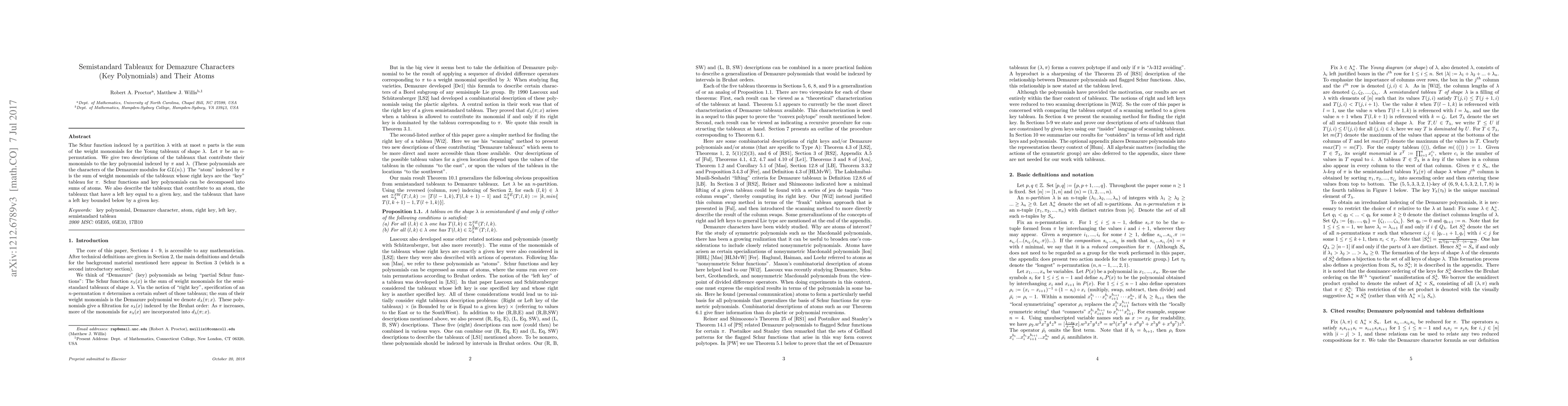 This paper explores semistandard tableaux contributing to Demazure characters (key polynomials) and their atoms, providing two descriptions of these tableaux. It also decomposes Schur functions and key polynomials into sums of atoms and describes the specific tableaux associated with left keys.