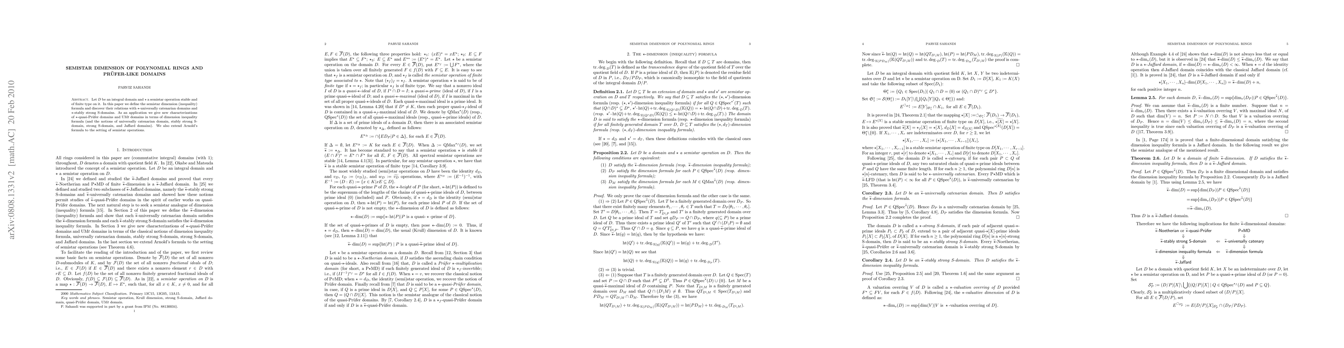 Let $D$ be an integral domain and $\star$ a semistar operation stable and of finite type on it. In this paper we define the semistar dimension (inequality) formula and discover their relations with $\star$-universally catenarian domains and $\star$-stably strong S-domains. As an application we give new characterizations of $\star$-quasi-Pr\"{u}fer domains and UM$t$ domains in terms of dimension inequality formula (and the notions of universally catenarian domain, stably strong S-domain, strong S-domain, and Jaffard domains). We also extend Arnold's formula to the setting of semistar operations.