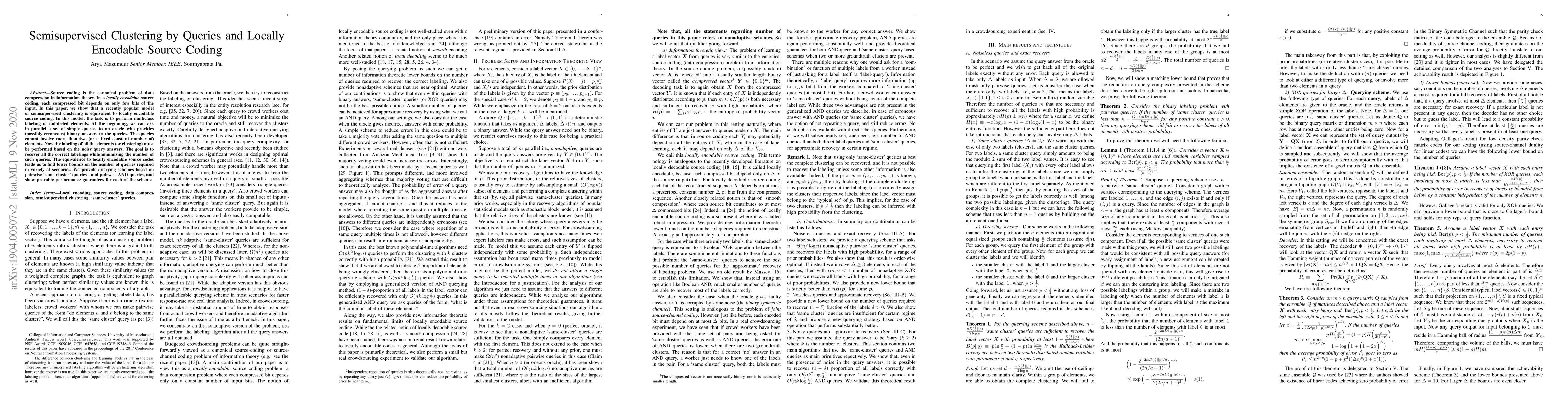 Source coding is the canonical problem of data compression in information theory. In a locally encodable source coding, each compressed bit depends on only few bits of the input. In this paper, we show that a recently popular model of semi-supervised clustering is equivalent to locally encodable source coding. In this model, the task is to perform multiclass labeling of unlabeled elements. At the beginning, we can ask in parallel a set of simple queries to an oracle who provides (possibly erroneous) binary answers to the queries. The queries cannot involve more than two (or a fixed constant number of) elements. Now the labeling of all the elements (or clustering) must be performed based on the noisy query answers. The goal is to recover all the correct labelings while minimizing the number of such queries. The equivalence to locally encodable source codes leads us to find lower bounds on the number of queries required in a variety of scenarios. We provide querying schemes based on pairwise `same cluster' queries - and pairwise AND queries and show provable performance guarantees for each of the schemes.