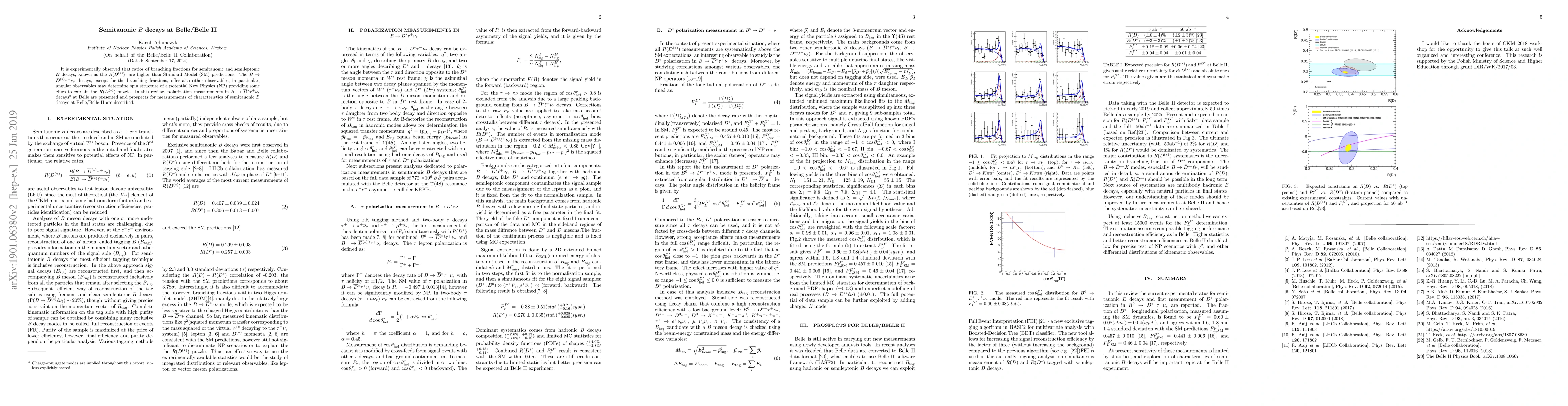 It is experimentally observed that ratios of branching fractions for semitauonic and semileptonic $B$ decays, known as the $R(D^{(*)})$, are higher than Standard Model (SM) predictions. The $B \to \bar{D}^{(*)} \tau^{+} \nu_{\tau}$ decays, except for the branching fractions, offer also other observables, in particular, angular observables may determine spin structure of a potential New Physics (NP) providing some clues to explain the $R(D^{(*)})$ puzzle. In this review, polarization measurements in $B \to \bar{D}^{*} \tau^{+} \nu_{\tau}$ decays at Belle are presented and prospects for measurements of characteristics of semitauonic $B$ decays at Belle/Belle II are described.