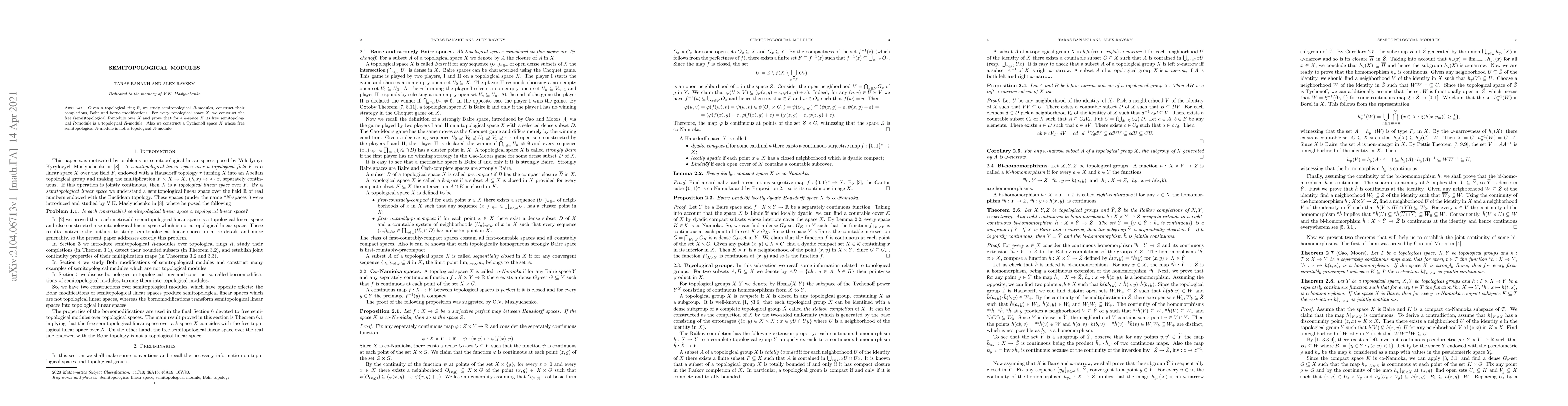Given a topological ring $R$, we study semitopological $R$-modules, construct their completions, Bohr and borno modifications. For every topological space $X$, we construct the free (semi)topological $R$-module over $X$ and prove that for a $k$-space $X$ its free semitopological $R$-module is a topological $R$-module. Also we construct a Tychonoff space $X$ whose free semitopological $R$-module is not a topological $R$-module.