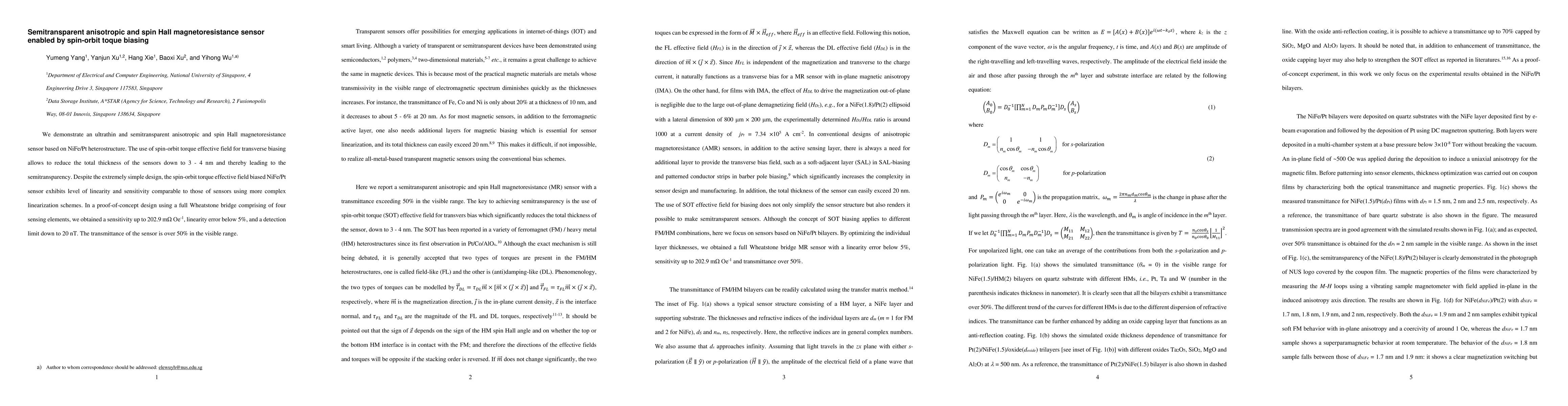 This paper presents a semitransparent anisotropic and spin Hall magnetoresistance sensor utilizing NiFe/Pt heterostructure with spin-orbit torque biasing, achieving a thickness of 3-4 nm and high sensitivity of 202.9 mΩ/Oe, while maintaining linearity error below 5% and a detection limit of 20 nT, with over 50% transmittance in the visible range.