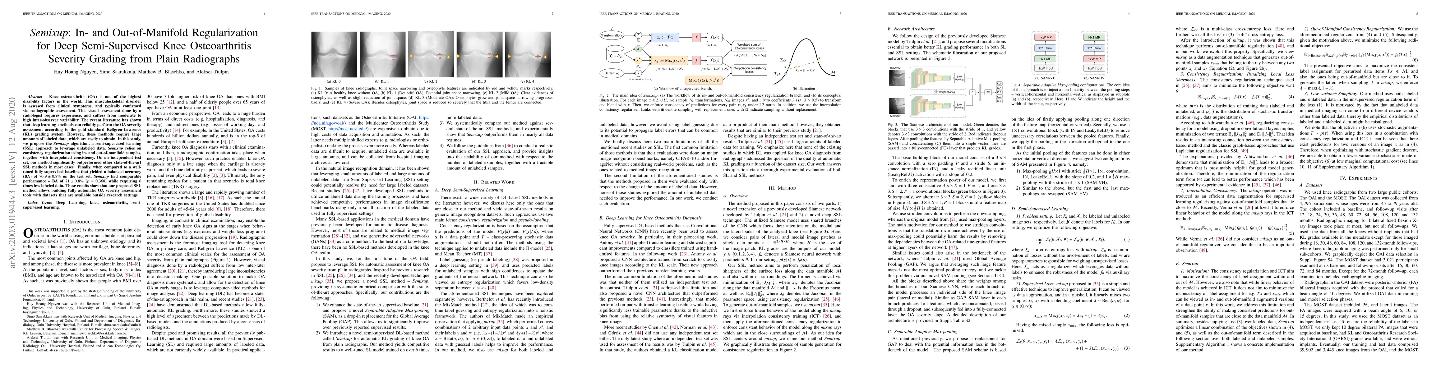 Knee osteoarthritis (OA) is one of the highest disability factors in the world. This musculoskeletal disorder is assessed from clinical symptoms, and typically confirmed via radiographic assessment. This visual assessment done by a radiologist requires experience, and suffers from moderate to high inter-observer variability. The recent literature has shown that deep learning methods can reliably perform the OA severity assessment according to the gold standard Kellgren-Lawrence (KL) grading system. However, these methods require large amounts of labeled data, which are costly to obtain. In this study, we propose the Semixup algorithm, a semi-supervised learning (SSL) approach to leverage unlabeled data. Semixup relies on consistency regularization using in- and out-of-manifold samples, together with interpolated consistency. On an independent test set, our method significantly outperformed other state-of-the-art SSL methods in most cases. Finally, when compared to a well-tuned fully supervised baseline that yielded a balanced accuracy (BA) of $70.9\pm0.8%$ on the test set, Semixup had comparable performance -- BA of $71\pm0.8%$ $(p=0.368)$ while requiring $6$ times less labeled data. These results show that our proposed SSL method allows building fully automatic OA severity assessment tools with datasets that are available outside research settings.