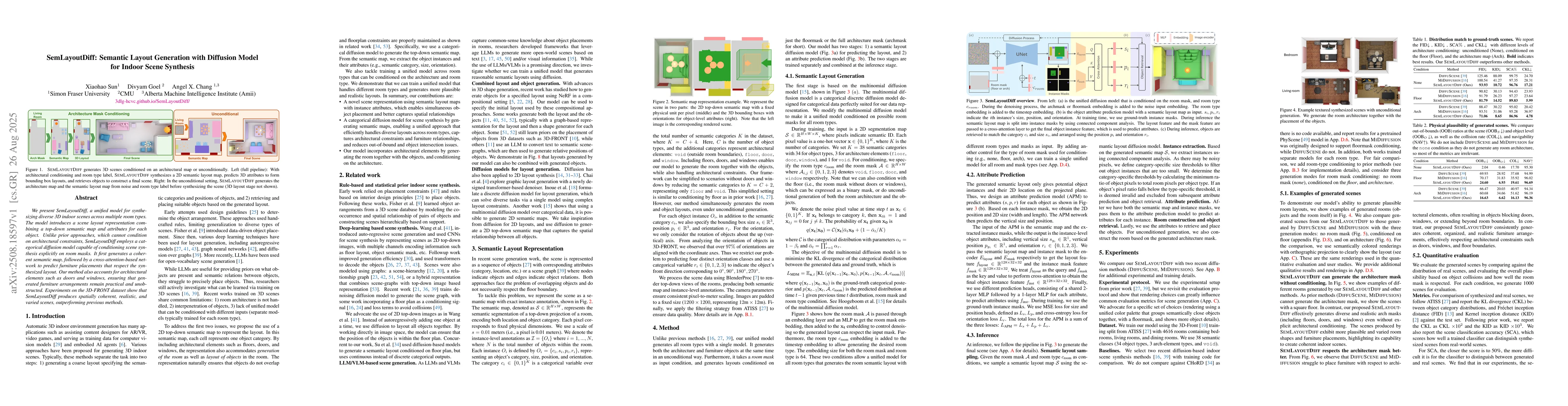 We present SemLayoutDiff, a unified model for synthesizing diverse 3D indoor scenes across multiple room types. The model introduces a scene layout representation combining a top-down semantic map and attributes for each object. Unlike prior approaches, which cannot condition on architectural constraints, SemLayoutDiff employs a categorical diffusion model capable of conditioning scene synthesis explicitly on room masks. It first generates a coherent semantic map, followed by a cross-attention-based network to predict furniture placements that respect the synthesized layout. Our method also accounts for architectural elements such as doors and windows, ensuring that generated furniture arrangements remain practical and unobstructed. Experiments on the 3D-FRONT dataset show that SemLayoutDiff produces spatially coherent, realistic, and varied scenes, outperforming previous methods.