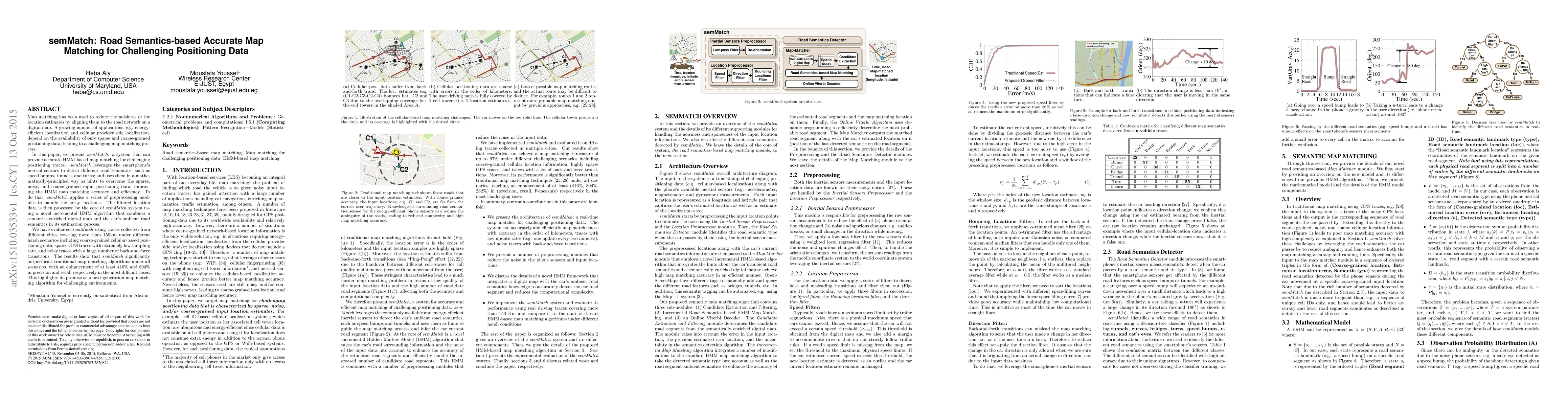 semMatch is an advanced HMM-based map matching system designed to improve accuracy for sparse and coarse-grained positioning data by leveraging smartphone inertial sensors to detect road semantics. It significantly outperforms traditional algorithms in challenging scenarios, achieving up to 894% improvement in recall.