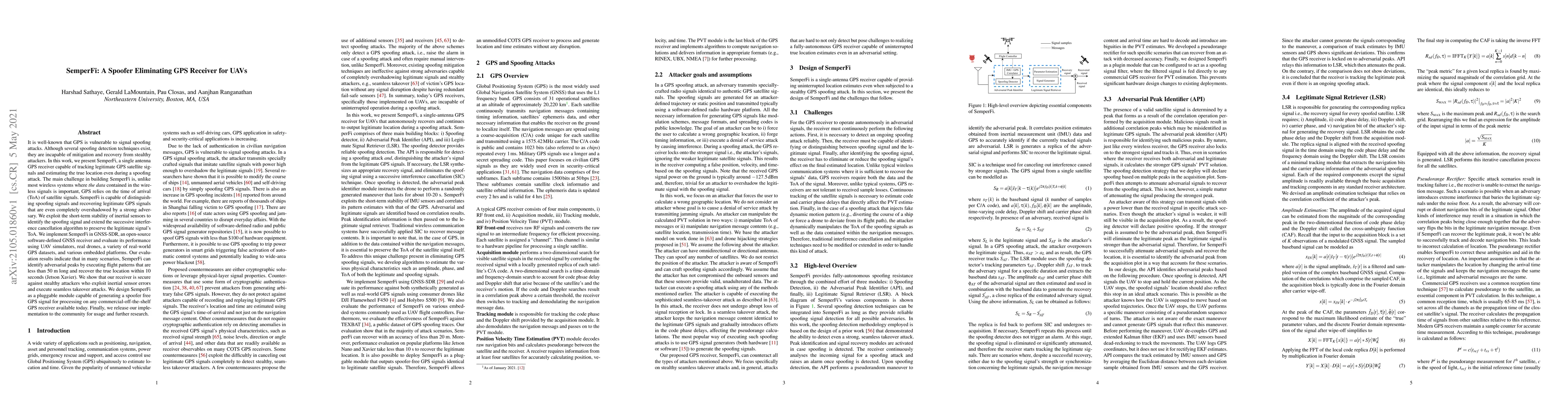 SemperFi is a novel single antenna GPS receiver designed to track legitimate GPS signals and estimate true location during spoofing attacks by leveraging inertial sensors and interference cancellation. It successfully identifies adversarial signals and recovers legitimate GPS signals even when overshadowed, demonstrating robust performance across various platforms and real-world scenarios.