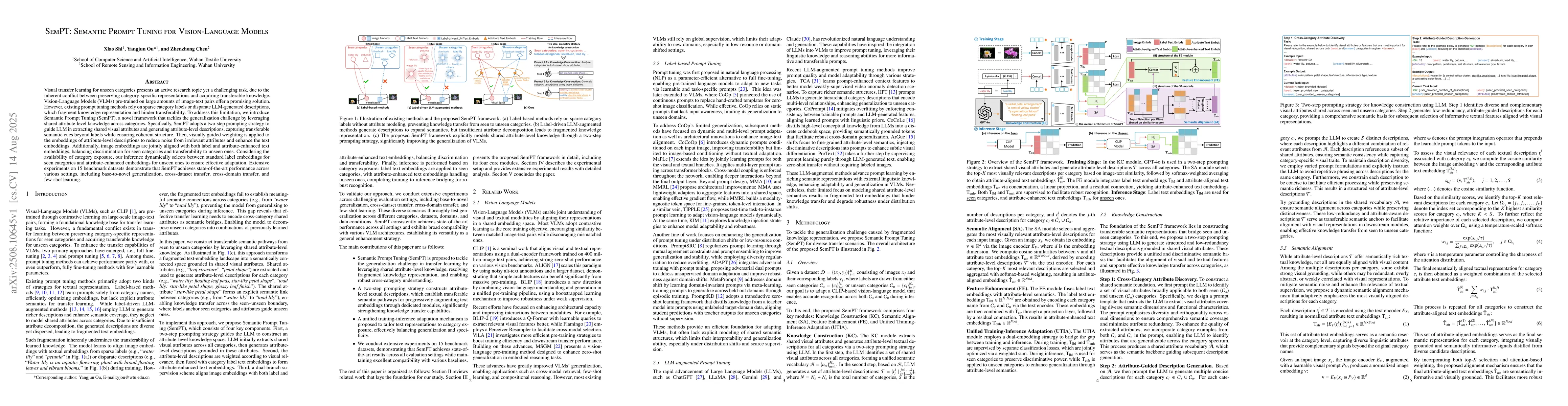 Visual transfer learning for unseen categories presents an active research topic yet a challenging task, due to the inherent conflict between preserving category-specific representations and acquiring transferable knowledge. Vision-Language Models (VLMs) pre-trained on large amounts of image-text pairs offer a promising solution. However, existing prompt tuning methods rely on sparse category labels or disparate LLM-generated descriptions, which fragment knowledge representation and hinder transferability. To address this limitation, we introduce Semantic Prompt Tuning (SemPT), a novel framework that tackles the generalization challenge by leveraging shared attribute-level knowledge across categories. Specifically, SemPT adopts a two-step prompting strategy to guide LLM in extracting shared visual attributes and generating attribute-level descriptions, capturing transferable semantic cues beyond labels while ensuring coherent structure. Then, visually guided weighting is applied to the embeddings of attribute-level descriptions to reduce noise from irrelevant attributes and enhance the text embeddings. Additionally, image embeddings are jointly aligned with both label and attribute-enhanced text embeddings, balancing discrimination for seen categories and transferability to unseen ones. Considering the availability of category exposure, our inference dynamically selects between standard label embeddings for seen categories and attribute-enhanced embeddings for unseen ones to ensure effective adaptation. Extensive experiments on 15 benchmark datasets demonstrate that SemPT achieves state-of-the-art performance across various settings, including base-to-novel generalization, cross-dataset transfer, cross-domain transfer, and few-shot learning.