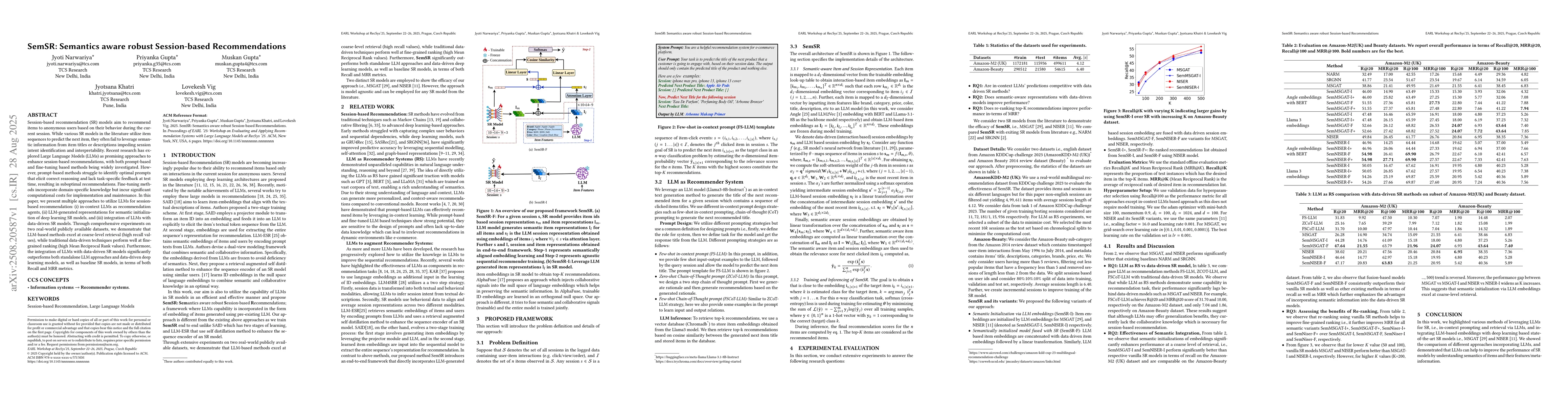 Session-based recommendation (SR) models aim to recommend items to anonymous users based on their behavior during the current session. While various SR models in the literature utilize item sequences to predict the next item, they often fail to leverage semantic information from item titles or descriptions impeding session intent identification and interpretability. Recent research has explored Large Language Models (LLMs) as promising approaches to enhance session-based recommendations, with both prompt-based and fine-tuning based methods being widely investigated. However, prompt-based methods struggle to identify optimal prompts that elicit correct reasoning and lack task-specific feedback at test time, resulting in sub-optimal recommendations. Fine-tuning methods incorporate domain-specific knowledge but incur significant computational costs for implementation and maintenance. In this paper, we present multiple approaches to utilize LLMs for session-based recommendation: (i) in-context LLMs as recommendation agents, (ii) LLM-generated representations for semantic initialization of deep learning SR models, and (iii) integration of LLMs with data-driven SR models. Through comprehensive experiments on two real-world publicly available datasets, we demonstrate that LLM-based methods excel at coarse-level retrieval (high recall values), while traditional data-driven techniques perform well at fine-grained ranking (high Mean Reciprocal Rank values). Furthermore, the integration of LLMs with data-driven SR models significantly out performs both standalone LLM approaches and data-driven deep learning models, as well as baseline SR models, in terms of both Recall and MRR metrics.