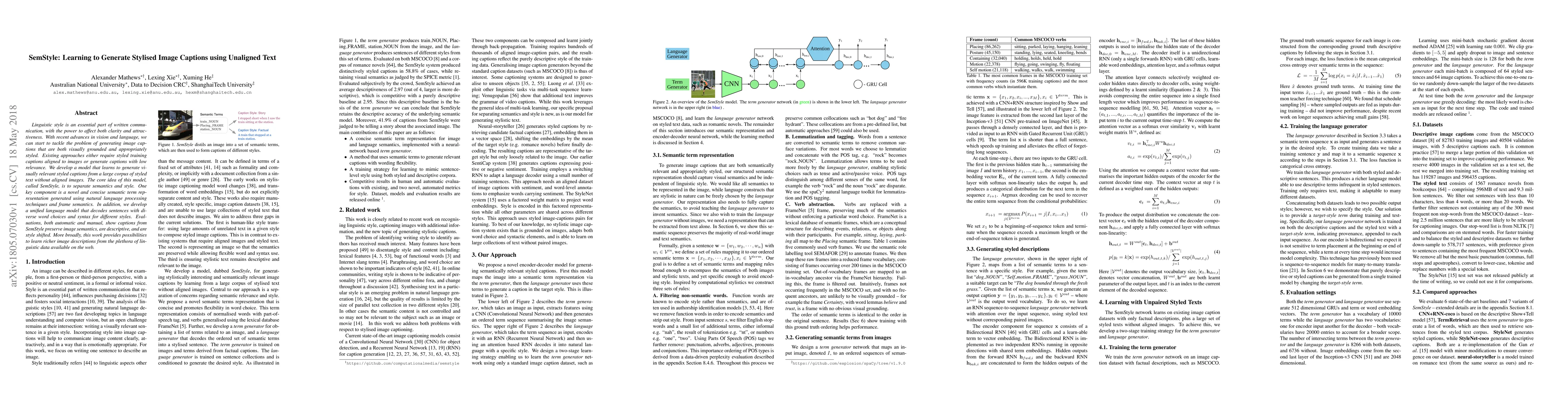 SemStyle is a model that generates visually relevant and stylistically varied image captions from unaligned text data, leveraging semantic term representations and a unified language model to separate semantics from style. Evaluations demonstrate that SemStyle produces descriptive, style-shifted captions that maintain image semantics.