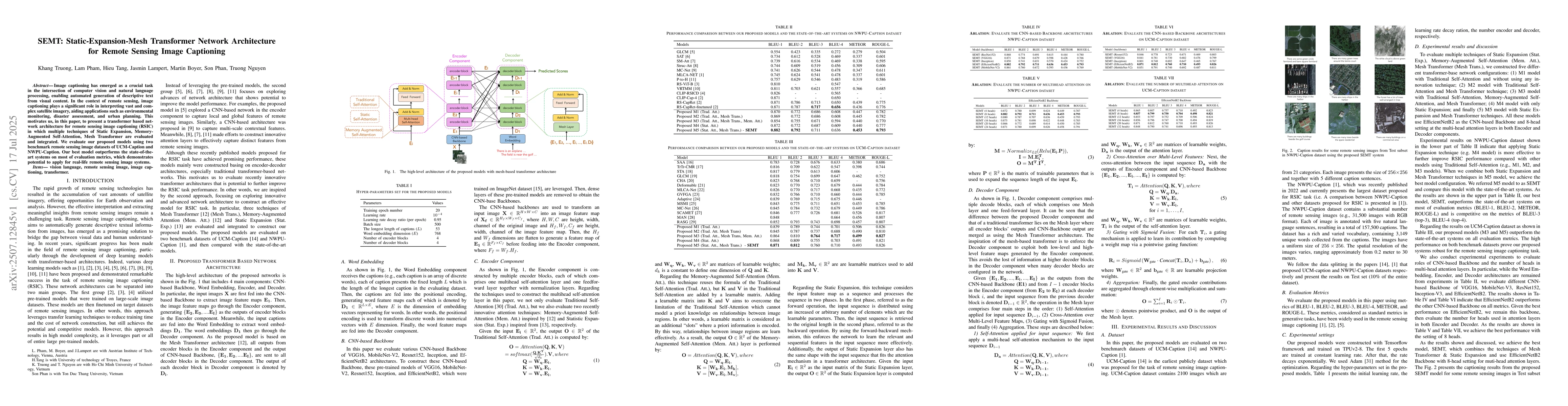 Image captioning has emerged as a crucial task in the intersection of computer vision and natural language processing, enabling automated generation of descriptive text from visual content. In the context of remote sensing, image captioning plays a significant role in interpreting vast and complex satellite imagery, aiding applications such as environmental monitoring, disaster assessment, and urban planning. This motivates us, in this paper, to present a transformer based network architecture for remote sensing image captioning (RSIC) in which multiple techniques of Static Expansion, Memory-Augmented Self-Attention, Mesh Transformer are evaluated and integrated. We evaluate our proposed models using two benchmark remote sensing image datasets of UCM-Caption and NWPU-Caption. Our best model outperforms the state-of-the-art systems on most of evaluation metrics, which demonstrates potential to apply for real-life remote sensing image systems.