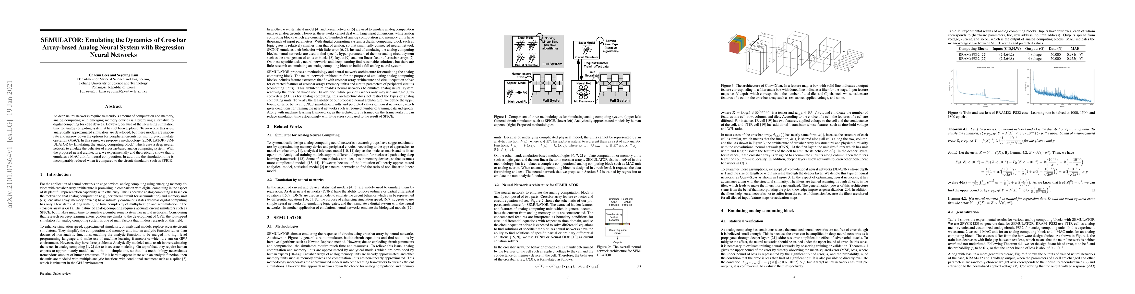 Title: SEMULATOR: Emulating the Dynamics of Crossbar Array-based Analog Neural System with Regression Neural Networks Summary: This paper proposes SEMULATOR, a deep neural network-based emulator for crossbar-based analog computing systems, significantly reducing simulation time compared to traditional circuit simulators while maintaining accurate emulation of multiply-accumulate operations.