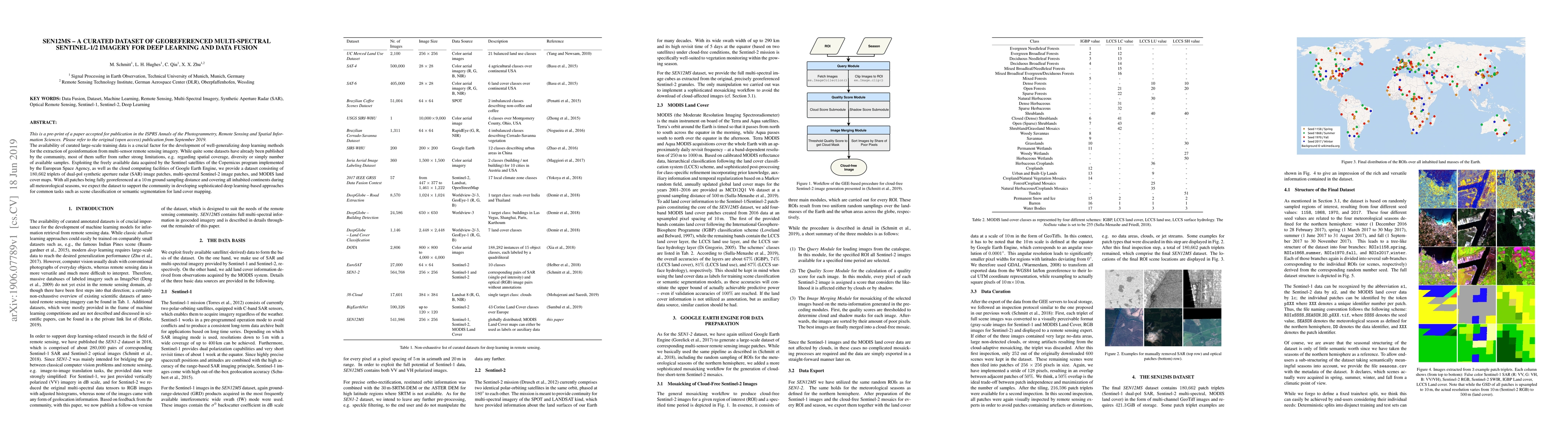 The SEN12MS dataset offers 180,662 georeferenced triplets of Sentinel-1 SAR, Sentinel-2 multi-spectral, and MODIS land cover data, aiming to enhance deep learning methods for remote sensing applications. The dataset's extensive spatial coverage and diverse samples are expected to facilitate advancements in scene classification and semantic segmentation.