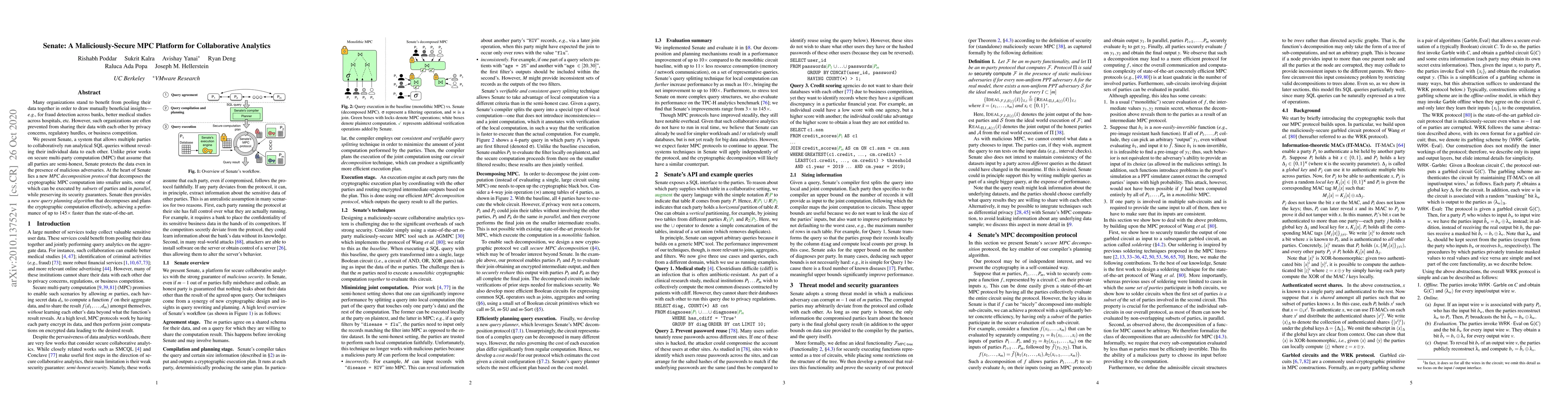 Many organizations stand to benefit from pooling their data together in order to draw mutually beneficial insights -- e.g., for fraud detection across banks, better medical studies across hospitals, etc. However, such organizations are often prevented from sharing their data with each other by privacy concerns, regulatory hurdles, or business competition. We present Senate, a system that allows multiple parties to collaboratively run analytical SQL queries without revealing their individual data to each other. Unlike prior works on secure multi-party computation (MPC) that assume that all parties are semi-honest, Senate protects the data even in the presence of malicious adversaries. At the heart of Senate lies a new MPC decomposition protocol that decomposes the cryptographic MPC computation into smaller units, some of which can be executed by subsets of parties and in parallel, while preserving its security guarantees. Senate then provides a new query planning algorithm that decomposes and plans the cryptographic computation effectively, achieving a performance of up to 145$\times$ faster than the state-of-the-art.