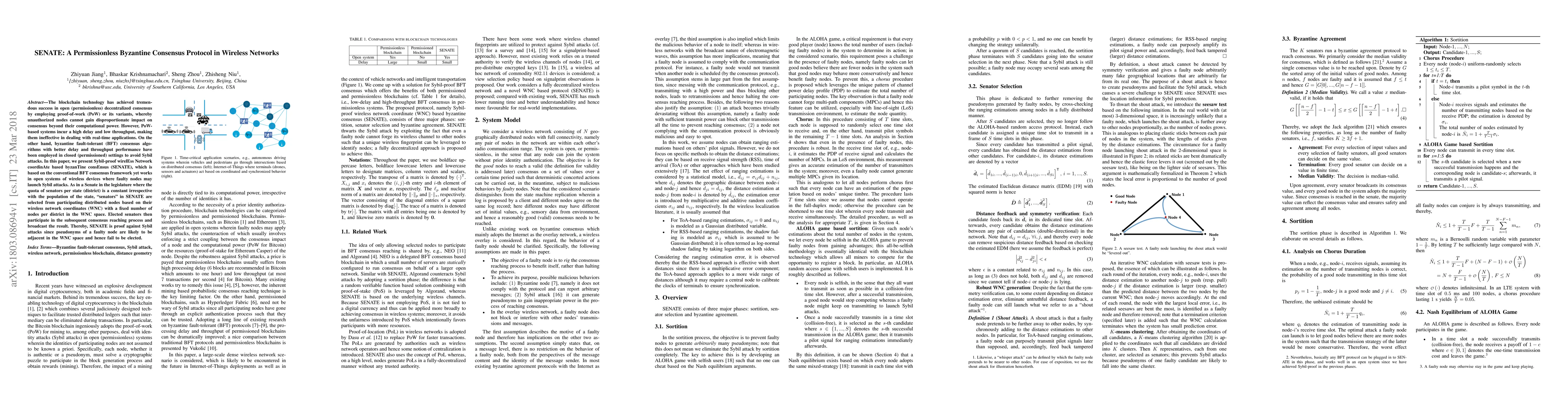 SENATE introduces a permissionless Byzantine consensus protocol for wireless networks, leveraging wireless network coordinates to select a fixed number of "senators" from distributed nodes, ensuring Sybil attacks are mitigated by the spatial distribution of network coordinates. This approach enhances delay and throughput compared to proof-of-work systems, making it suitable for real-time applications.