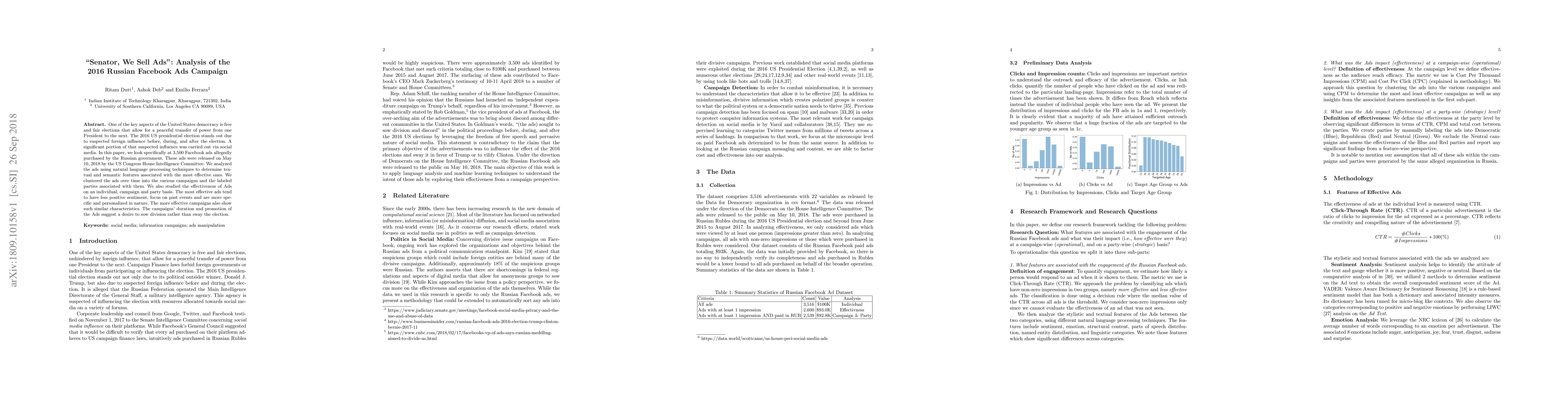 One of the key aspects of the United States democracy is free and fair elections that allow for a peaceful transfer of power from one President to the next. The 2016 US presidential election stands out due to suspected foreign influence before, during, and after the election. A significant portion of that suspected influence was carried out via social media. In this paper, we look specifically at 3,500 Facebook ads allegedly purchased by the Russian government. These ads were released on May 10, 2018 by the US Congress House Intelligence Committee. We analyzed the ads using natural language processing techniques to determine textual and semantic features associated with the most effective ones. We clustered the ads over time into the various campaigns and the labeled parties associated with them. We also studied the effectiveness of Ads on an individual, campaign and party basis. The most effective ads tend to have less positive sentiment, focus on past events and are more specific and personalized in nature. The more effective campaigns also show such similar characteristics. The campaigns' duration and promotion of the Ads suggest a desire to sow division rather than sway the election.