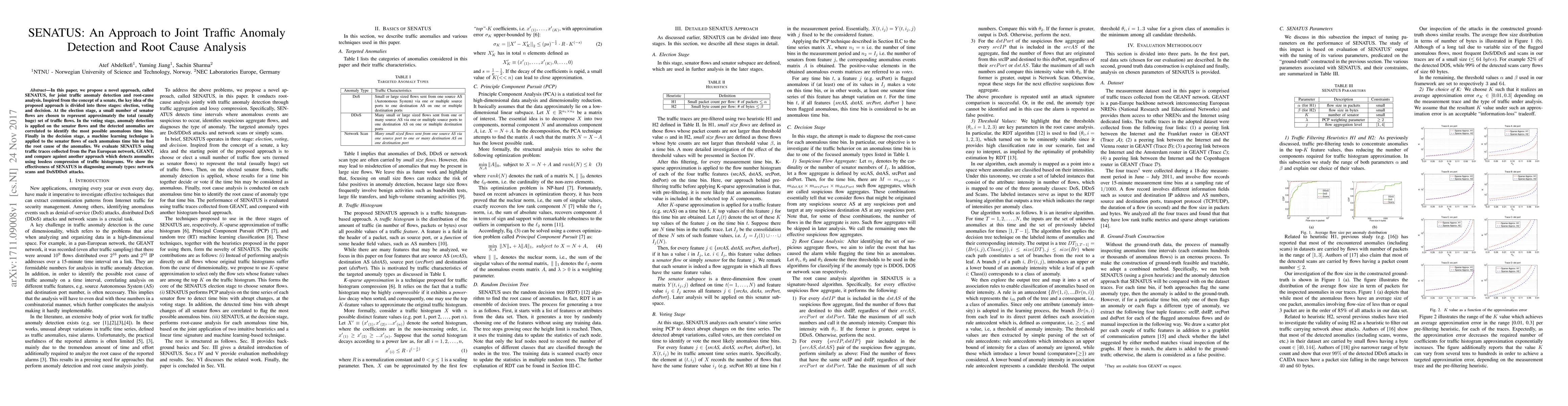 SENATUS is a novel approach for joint traffic anomaly detection and root-cause analysis, employing a three-stage process: election, voting, and decision. It identifies anomalous time bins and determines their root causes using machine learning, demonstrating effectiveness in detecting network scans and DoS/DDoS attacks.