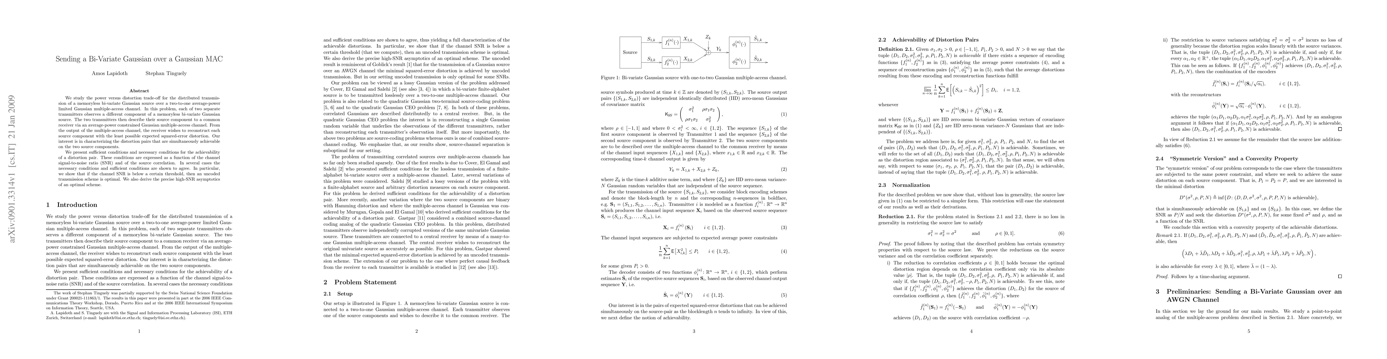 This paper investigates the optimal power versus distortion trade-off for transmitting a memoryless bi-variate Gaussian source over a Gaussian multiple-access channel, deriving conditions for achievable distortion pairs that depend on channel SNR and source correlation. It finds that uncoded transmission is optimal when SNR is below a threshold and provides high-SNR asymptotics for optimal schemes.