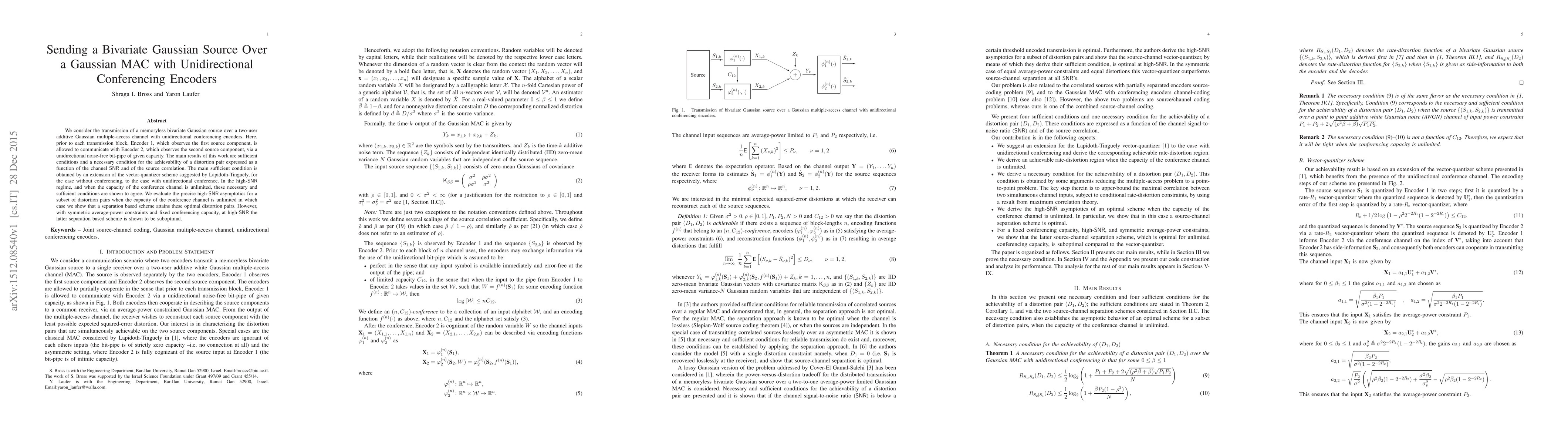 This paper explores the transmission of a bivariate Gaussian source over a two-user additive Gaussian channel with unidirectional conferencing encoders. It provides sufficient and necessary conditions for achieving optimal distortion pairs, extending a vector-quantizer scheme to include conferencing, and shows that while these conditions agree in high-SNR scenarios with unlimited conferencing capacity, they are suboptimal with fixed capacity and high SNR.