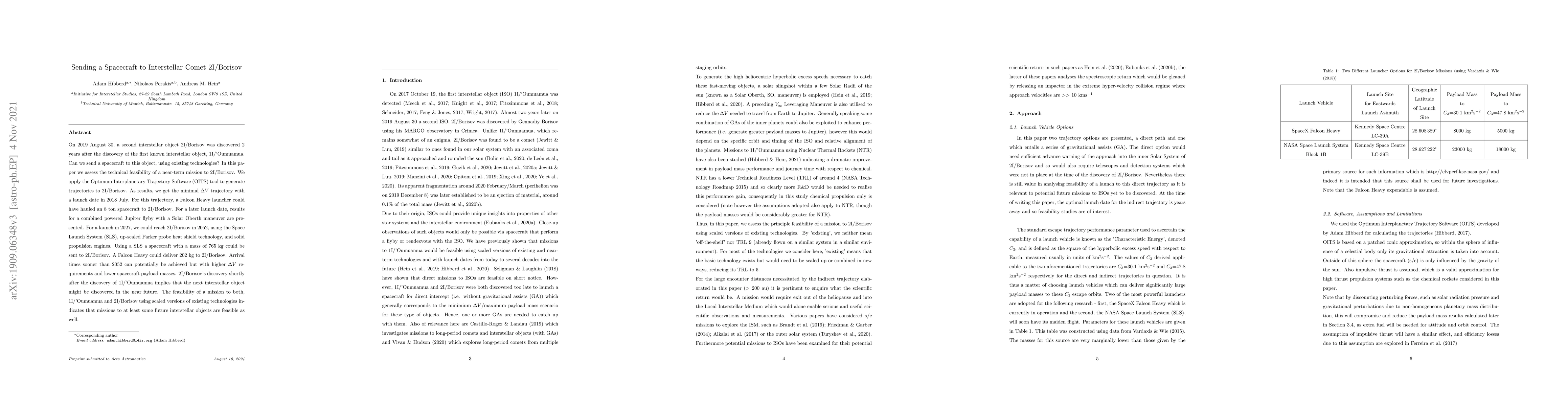 In August 2019, a second interstellar object 2I/Borisov was discovered 2 years after the discovery of the first known interstellar object, 1I/'Oumuamua. Can we send a spacecraft to this object, using existing technologies? In this paper we assess the technical feasibility of a near-term mission to 2I/Borisov. We apply the Optimum Interplanetary Trajectory Software (OITS) tool to generate trajectories to 2I/Borisov. As results, we get the minimal $\Delta V$ trajectory with a launch date in July 2018. For this trajectory, a Falcon Heavy launcher could have hauled an 8 ton spacecraft to 2I/Borisov. For a later launch date, results for a combined powered Jupiter flyby with a Solar Oberth maneuver are presented. For a launch in 2027, we could reach 2I/Borisov in 2052, using the Space Launch System (SLS), up-scaled Parker probe heat shield technology, and solid propulsion engines. Using a SLS a spacecraft with a mass of 765 kg could be sent to 2I/Borisov. A Falcon Heavy could deliver 202 kg to 2I/Borisov. Arrival times sooner than 2052 can potentially be achieved but with higher $\Delta V$ requirements and lower spacecraft payload masses. 2I/Borisov's discovery shortly after the discovery of 1I/'Oumuamua implies that the next interstellar object might be discovered in the near future. The feasibility of a mission to both, 1I/'Oumuamua and 2I/Borisov using existing technologies indicates that missions to at least some future interstellar objects are feasible as well.