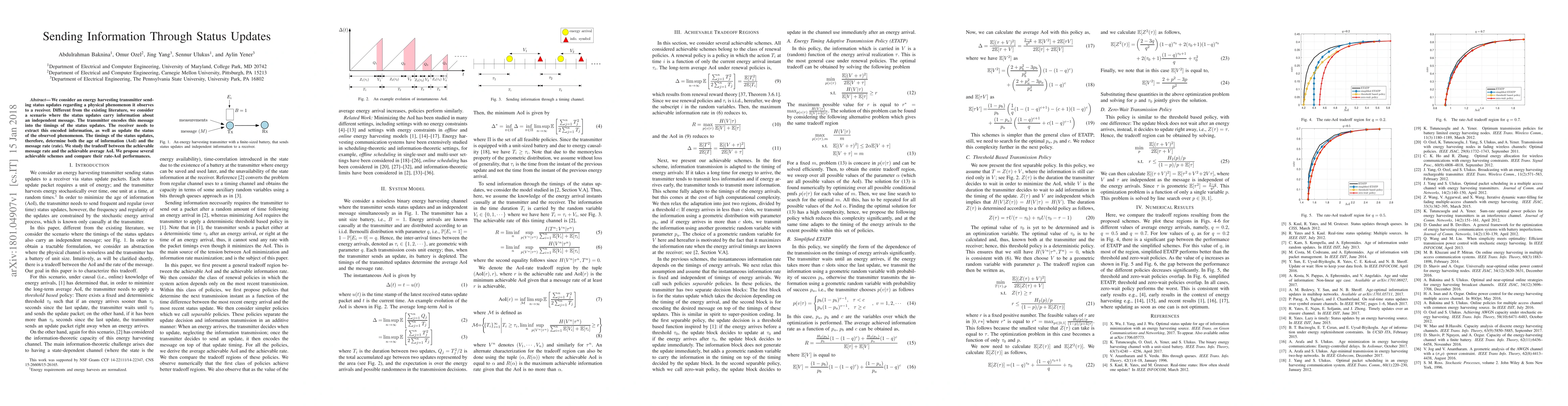 We consider an energy harvesting transmitter sending status updates regarding a physical phenomenon it observes to a receiver. Different from the existing literature, we consider a scenario where the status updates carry information about an independent message. The transmitter encodes this message into the timings of the status updates. The receiver needs to extract this encoded information, as well as update the status of the observed phenomenon. The timings of the status updates, therefore, determine both the age of information (AoI) and the message rate (rate). We study the tradeoff between the achievable message rate and the achievable average AoI. We propose several achievable schemes and compare their rate-AoI performances.
