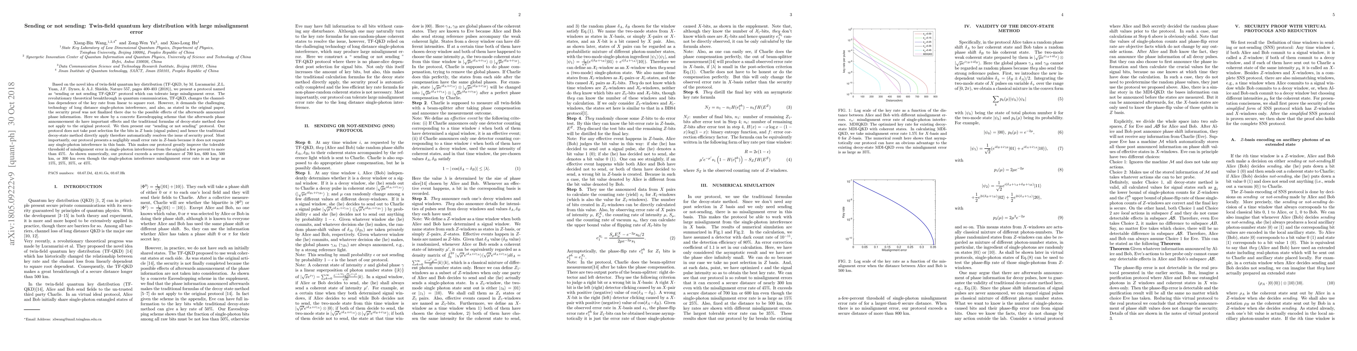 Title: Sending or not sending: twin-field quantum key distribution with large misalignment error Summary: This paper introduces a novel twin-field quantum key distribution protocol that remains fault tolerant even with a 15% misalignment error, allowing secure communication over distances exceeding 700 km. Without misalignment, the protocol can achieve secure distances over 800 km.