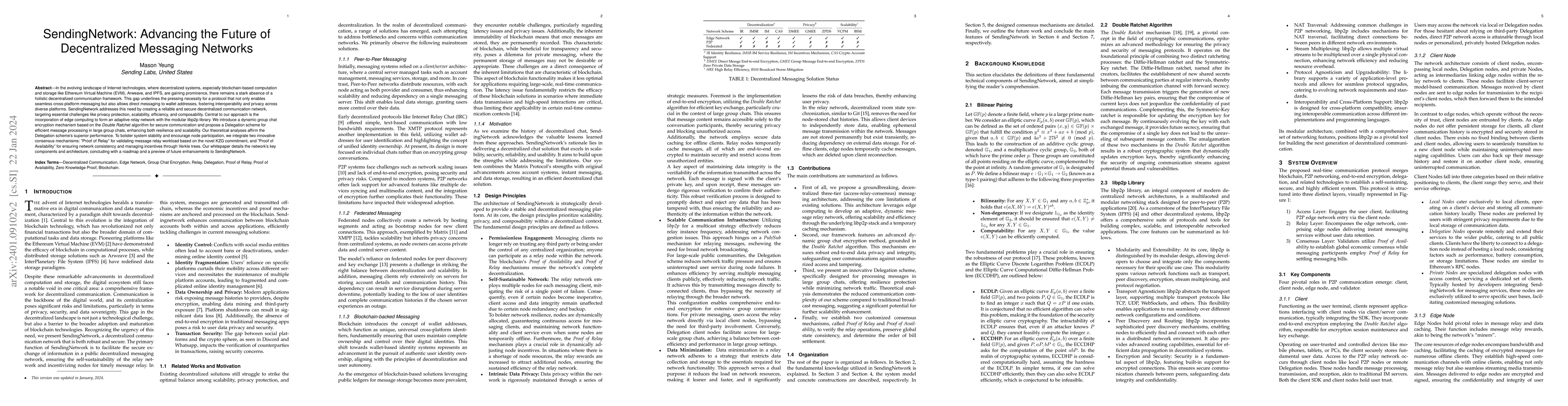 SendingNetwork introduces a decentralized communication framework addressing privacy, scalability, and efficiency challenges through edge computing, a Double Ratchet encryption mechanism, and a Delegation scheme for large group chats. It employs novel consensus mechanisms, "Proof of Relay" and "Proof of Availability," to enhance network stability and incentivize node participation.
