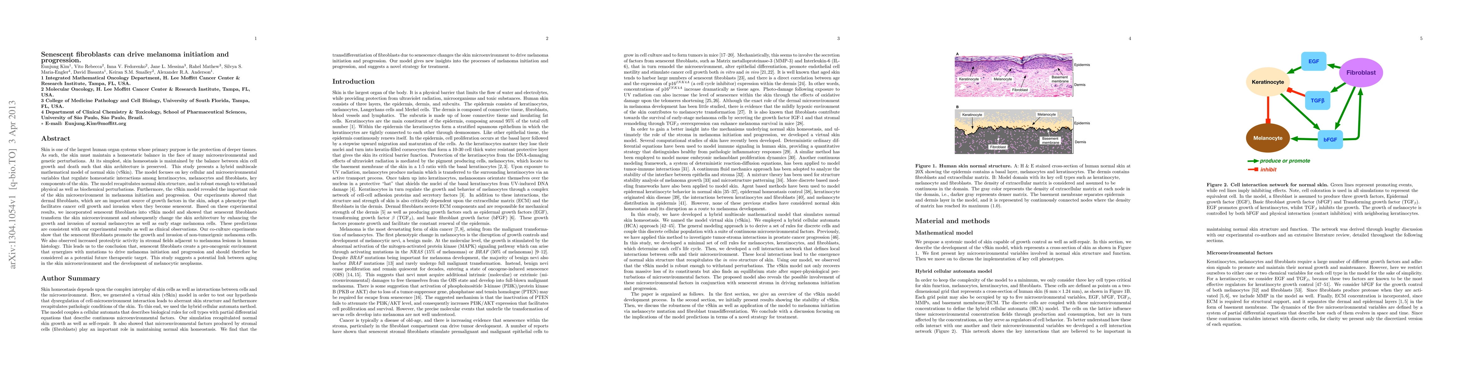 Skin is one of the largest human organ systems whose primary purpose is the protection of deeper tissues. As such, the skin must maintain a homeostatic balance in the face of many microenvironmental and genetic perturbations. At its simplest, skin homeostasis is maintained by the balance between skin cell growth and death such that skin architecture is preserved. This study presents a hybrid multiscale mathematical model of normal skin (vSkin). The model focuses on key cellular and microenvironmental variables that regulate homeostatic interactions among keratinocytes, melanocytes and fibroblasts, key components of the skin. The model recapitulates normal skin structure, and is robust enough to withstand physical as well as biochemical perturbations. Furthermore, the vSkin model revealed the important role of the skin microenvironment in melanoma initiation and progression. Our experiments showed that dermal fibroblasts, which are an important source of growth factors in the skin, adopt a phenotype that facilitates cancer cell growth and invasion when they become senescent. Based on these experimental results, we incorporated senescent fibroblasts into vSkin model and showed that senescent fibroblasts transform the skin microenvironment and enhance the growth and invasion of normal melanocytes as well as early stage melanoma cells. These predictions are consistent with our experimental results as well as clinical observations. Our co-culture experiments show that the senescent fibroblasts promote the growth and invasion of non-tumorigenic melanoma cells. We also observed increased proteolytic activity in stromal fields adjacent to melanoma lesions in human histology. Collectively, senescent fibroblasts create a pro-oncogenic environment that synergizes with mutations to drive melanoma initiation and progression and should therefore be considered as a potential future therapeutic target.