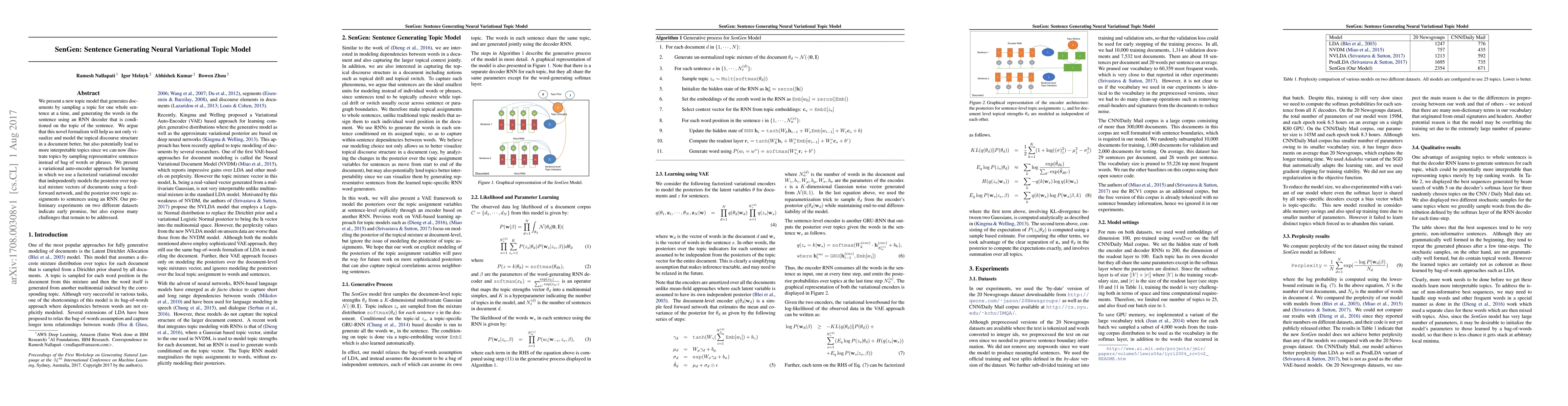 The SenGen model generates documents sentence by sentence using an RNN decoder conditioned on topic-specific vectors, aiming for better interpretable topics through representative sentence sampling. Preliminary results show promise but highlight remaining challenges in the approach.