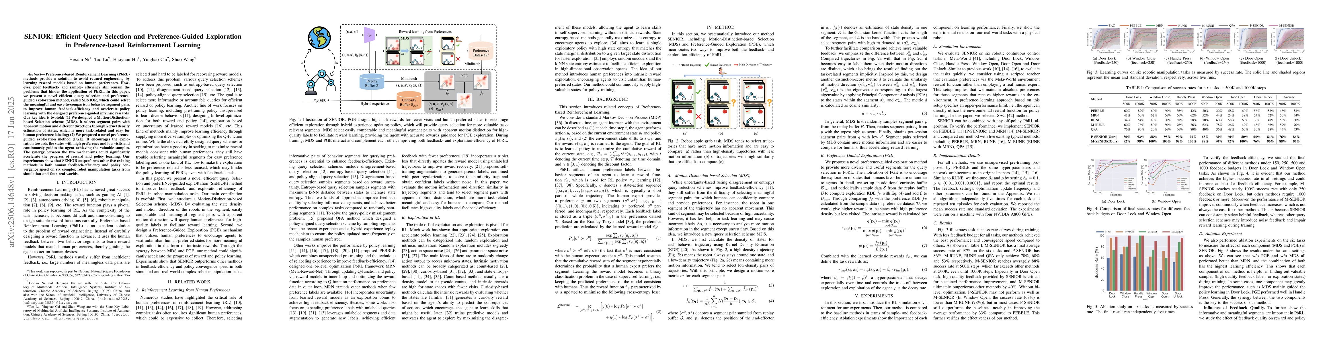 Preference-based Reinforcement Learning (PbRL) methods provide a solution to avoid reward engineering by learning reward models based on human preferences. However, poor feedback- and sample- efficiency still remain the problems that hinder the application of PbRL. In this paper, we present a novel efficient query selection and preference-guided exploration method, called SENIOR, which could select the meaningful and easy-to-comparison behavior segment pairs to improve human feedback-efficiency and accelerate policy learning with the designed preference-guided intrinsic rewards. Our key idea is twofold: (1) We designed a Motion-Distinction-based Selection scheme (MDS). It selects segment pairs with apparent motion and different directions through kernel density estimation of states, which is more task-related and easy for human preference labeling; (2) We proposed a novel preference-guided exploration method (PGE). It encourages the exploration towards the states with high preference and low visits and continuously guides the agent achieving the valuable samples. The synergy between the two mechanisms could significantly accelerate the progress of reward and policy learning. Our experiments show that SENIOR outperforms other five existing methods in both human feedback-efficiency and policy convergence speed on six complex robot manipulation tasks from simulation and four real-worlds.