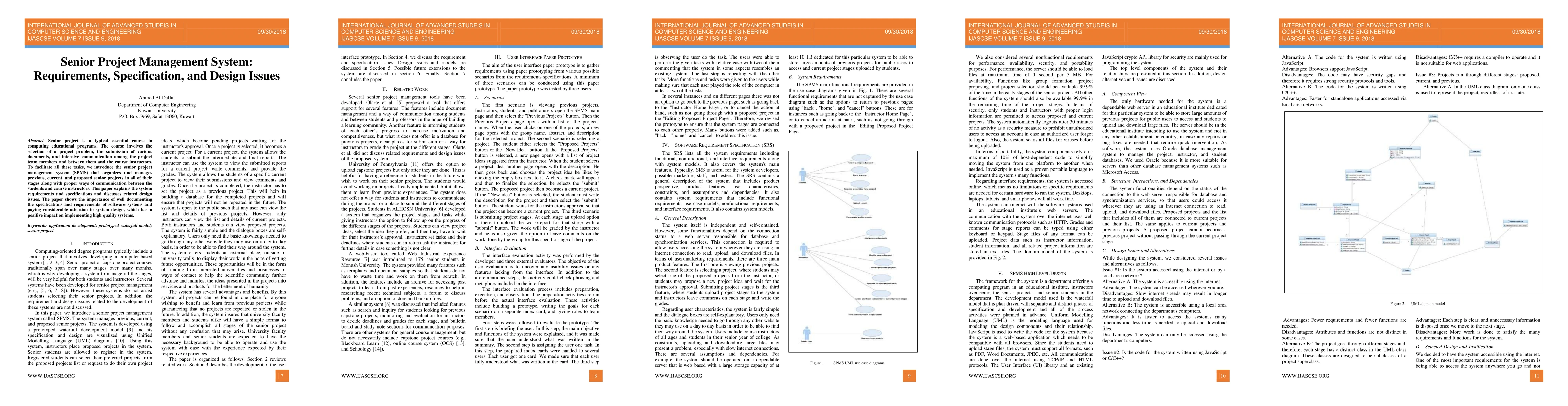 This paper presents the senior project management system (SPMS) designed to streamline the management of senior project tasks in computing education, detailing its requirements, specifications, and design considerations. It emphasizes the importance of thorough documentation and careful design for the successful implementation of high-quality software systems.