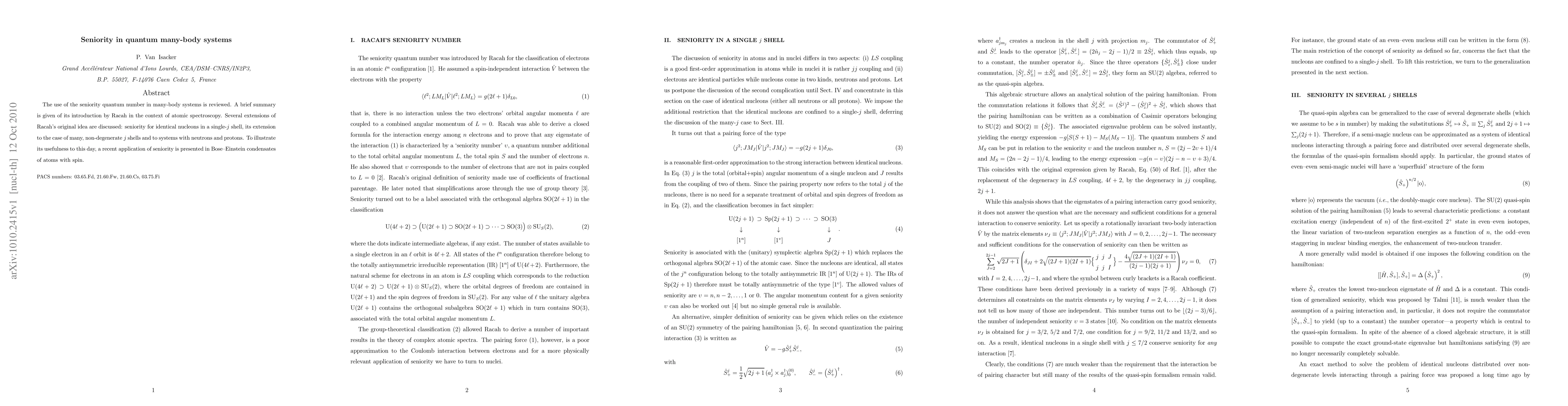 The use of the seniority quantum number in many-body systems is reviewed. A brief summary is given of its introduction by Racah in the context of atomic spectroscopy. Several extensions of Racah's original idea are discussed: seniority for identical nucleons in a single-$j$ shell, its extension to the case of many, non-degenerate $j$ shells and to systems with neutrons and protons. To illustrate its usefulness to this day, a recent application of seniority is presented in Bose--Einstein condensates of atoms with spin.