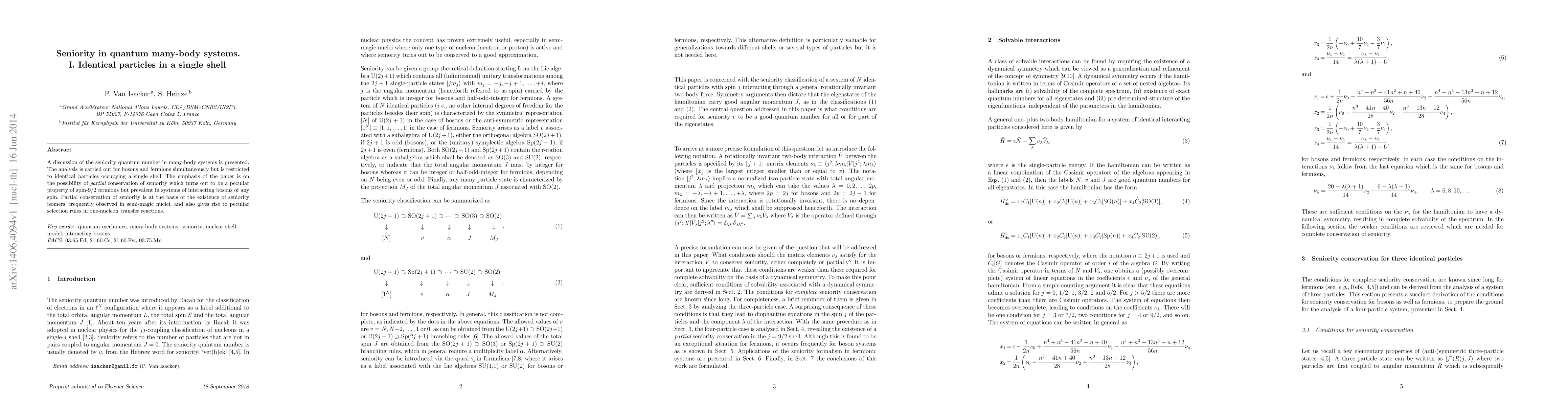 This paper explores the concept of seniority quantum number in quantum many-body systems, focusing on identical particles in a single shell. It highlights the phenomenon of partial conservation of seniority, particularly in spin-9/2 fermions and interacting bosons, which underpins the existence of seniority isomers and unique selection rules in nuclear reactions.