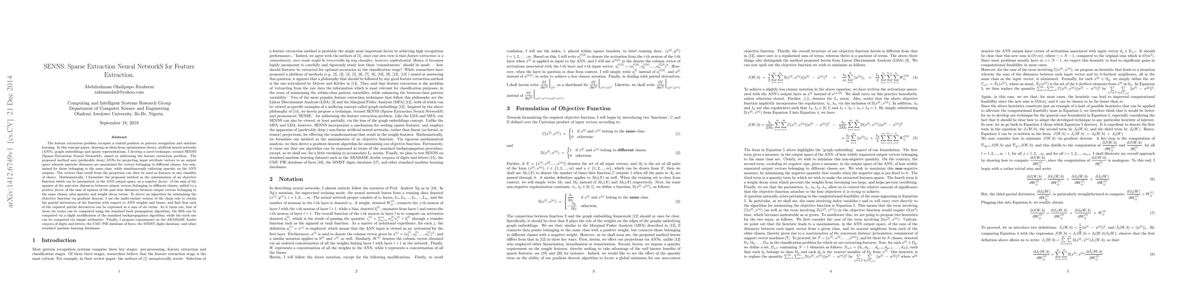 By drawing on ideas from optimisation theory, artificial neural networks (ANN), graph embeddings and sparse representations, I develop a novel technique, termed SENNS (Sparse Extraction Neural NetworkS), aimed at addressing the feature extraction problem. The proposed method uses (preferably deep) ANNs for projecting input attribute vectors to an output space wherein pairwise distances are maximized for vectors belonging to different classes, but minimized for those belonging to the same class, while simultaneously enforcing sparsity on the ANN outputs. The vectors that result from the projection can then be used as features in any classifier of choice. Mathematically, I formulate the proposed method as the minimisation of an objective function which can be interpreted, in the ANN output space, as a negative factor of the sum of the squares of the pair-wise distances between output vectors belonging to different classes, added to a positive factor of the sum of squares of the pair-wise distances between output vectors belonging to the same classes, plus sparsity and weight decay terms. To derive an algorithm for minimizing the objective function via gradient descent, I use the multi-variate version of the chain rule to obtain the partial derivatives of the function with respect to ANN weights and biases, and find that each of the required partial derivatives can be expressed as a sum of six terms. As it turns out, four of those six terms can be computed using the standard back propagation algorithm; the fifth can be computed via a slight modification of the standard backpropagation algorithm; while the sixth one can be computed via simple arithmetic. Finally, I propose experiments on the ARABASE Arabic corpora of digits and letters, the CMU PIE database of faces, the MNIST digits database, and other standard machine learning databases.