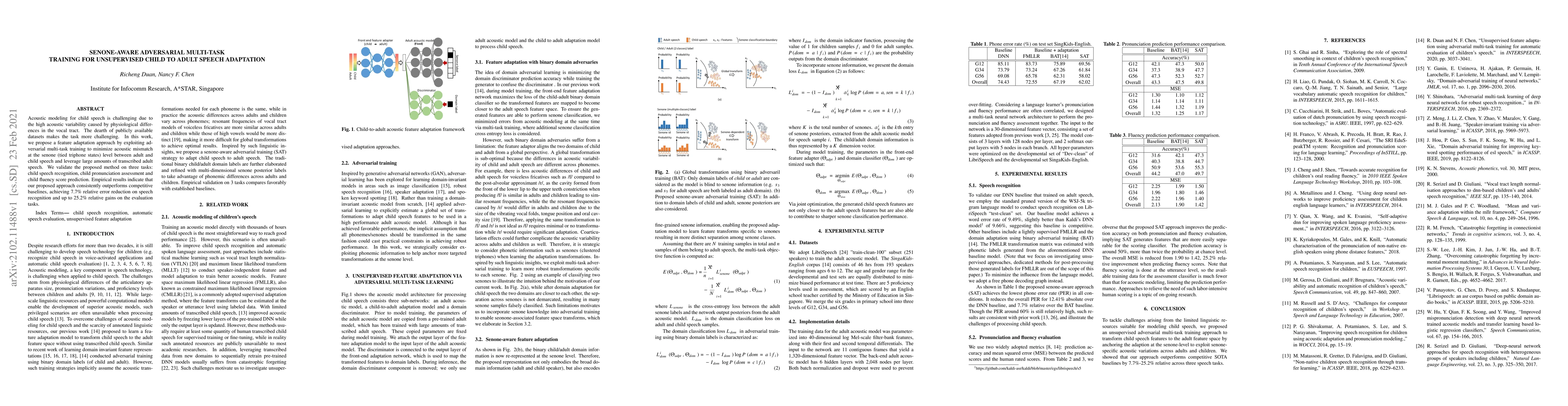 Acoustic modeling for child speech is challenging due to the high acoustic variability caused by physiological differences in the vocal tract. The dearth of publicly available datasets makes the task more challenging. In this work, we propose a feature adaptation approach by exploiting adversarial multi-task training to minimize acoustic mismatch at the senone (tied triphone states) level between adult and child speech and leverage large amounts of transcribed adult speech. We validate the proposed method on three tasks: child speech recognition, child pronunciation assessment, and child fluency score prediction. Empirical results indicate that our proposed approach consistently outperforms competitive baselines, achieving 7.7% relative error reduction on speech recognition and up to 25.2% relative gains on the evaluation tasks.