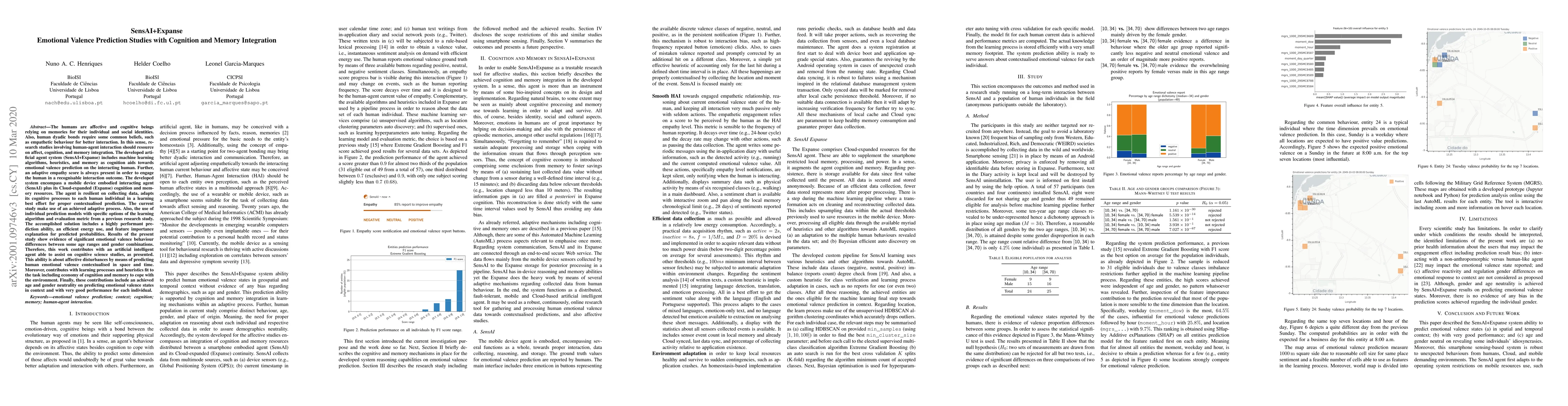 The humans are affective and cognitive beings relying on memories for their individual and social identities. Also, human dyadic bonds require some common beliefs such as empathetic behaviour for better interaction. In this sense, research studies involving human-agent interaction should resource on affect, cognition, and memory integration. The developed artificial agent system (SensAI+Expanse) includes machine learning algorithms, heuristics, and memory as cognition aids towards emotional valence prediction on the interacting human. Further, an adaptive empathy score is always present in order to engage the human in a recognisable interaction outcome. [...] The agent is resilient on collecting data, adapts its cognitive processes to each human individual in a learning best effort for proper contextualised prediction. The current study make use of an achieved adaptive process. Also, the use of individual prediction models with specific options of the learning algorithm and evaluation metric from a previous research study. The accomplished solution includes a highly performant prediction ability, an efficient energy use, and feature importance explanation for predicted probabilities. Results of the present study show evidence of significant emotional valence behaviour differences between some age ranges and gender combinations. Therefore, this work contributes with an artificial intelligent agent able to assist on cognitive science studies. This ability is about affective disturbances by means of predicting human emotional valence contextualised in space and time. Moreover, contributes with learning processes and heuristics fit to the task including economy of cognition and memory to cope with the environment. Finally, these contributions include an achieved age and gender neutrality on predicting emotional valence states in context and with very good performance for each individual.