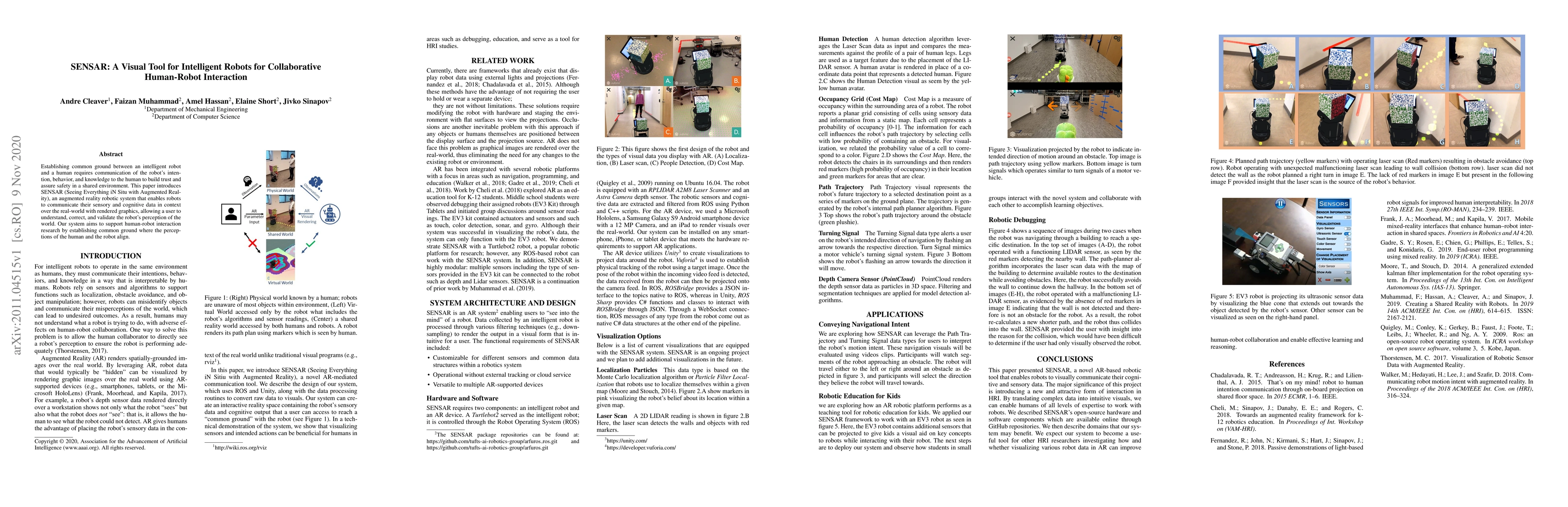 SENSAR is an augmented reality system designed to enhance human-robot interaction by visually communicating a robot's sensory and cognitive data in real-time, fostering trust and safety. It aims to align human and robotic perceptions for effective collaboration.