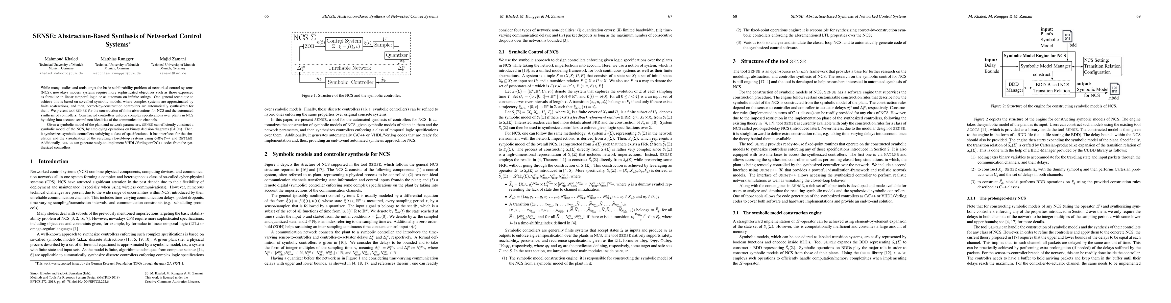 The SENSE tool synthesizes controllers for networked control systems (NCS) by constructing finite abstractions using symbolic models and BDDs, ensuring compliance with complex specifications while considering communication channel non-idealities. It generates implementable code and supports simulation and visualization.