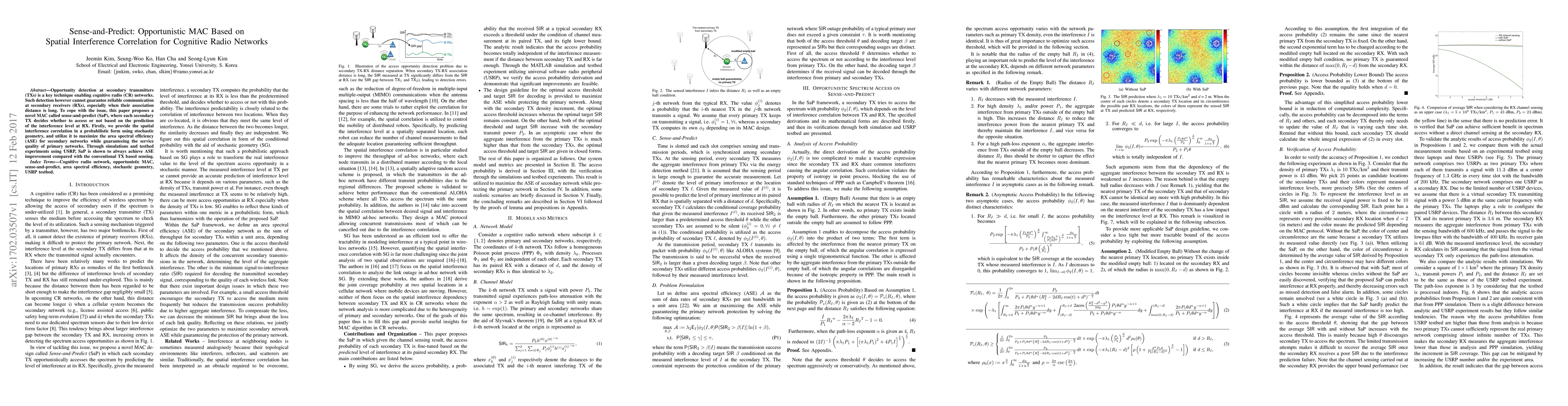 This paper introduces a novel MAC protocol called sense-and-predict (SaP) for cognitive radio networks, which uses spatial interference correlation to predict interference levels at receivers to optimize access decisions. The proposed method improves area spectral efficiency while maintaining primary network service quality.