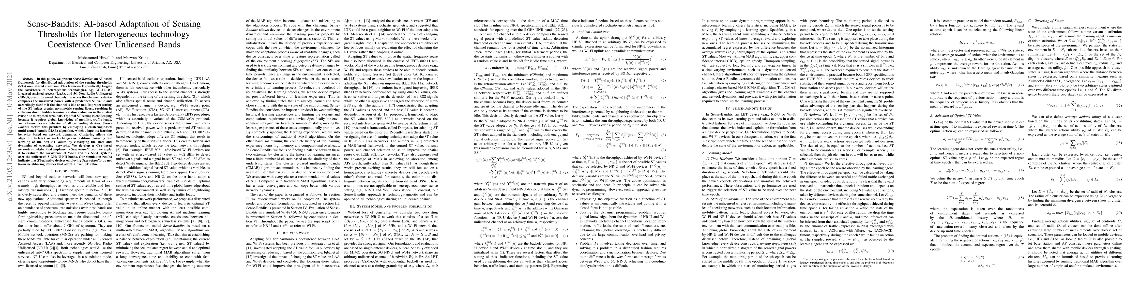 In this paper, we present Sense-Bandits, an AI-based framework for distributed adaptation of the sensing thresholds (STs) over shared spectrum. This framework specifically targets the coexistence of heterogenous technologies, e.g., Wi-Fi, 4G Licensed-Assisted Access (LAA), and 5G New Radio Unlicensed (NR-U), over unlicensed channels. To access the channel, a device compares the measured power with a predefined ST value and accordingly decides if the channel is idle or not. Improper setting of the ST values creates asymmetric sensing floors, resulting in collisions due to hidden terminals and/or reduction in the spatial reuse due to exposed terminals. Optimal ST setting is challenging because it requires global knowledge of mobility, traffic loads, and channel access behavior of all contending devices. Sense- Bandits tackles this problem by employing a clustering-based multi-armed bandit (MAB) algorithm, which adapts its learning behavior based on network dynamics. Clustering allows the algorithm to track network changes in real-time, ensuring fast learning of the best ST values by classifying the state and dynamics of coexisting networks. We develop a C++-based network simulator that implements Sense-Bandits and we apply it to evaluate the coexistence of Wi-Fi and 5G NR-U systems over the unlicensed 5 GHz U NII bands. Our simulation results indicate that ST-adaptive devices employing Sense-Bandits do not harm neighboring devices that adopt a fixed ST value.