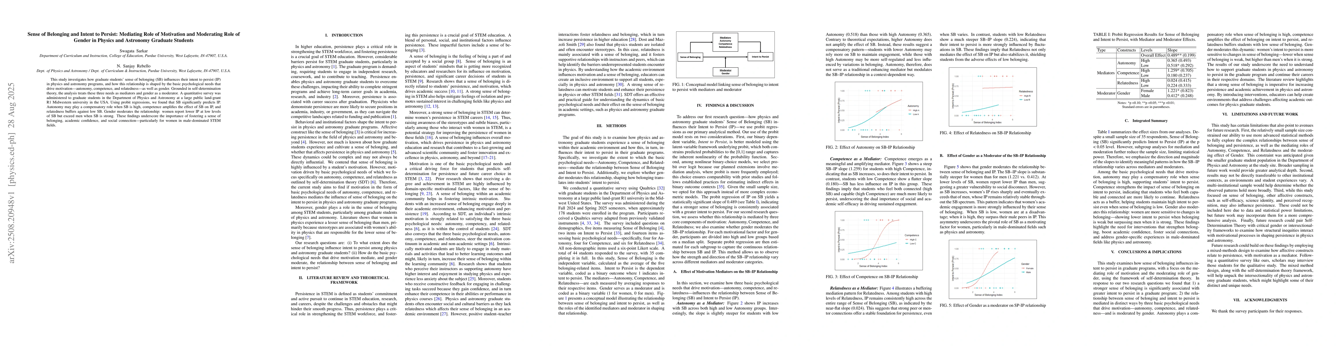 This study investigates how graduate students' sense of belonging (SB) influences their intent to persist (IP) in physics and astronomy programs, and how this relationship is shaped by the basic psychological needs that drive motivation-autonomy, competence, and relatedness-as well as gender. Grounded in self-determination theory, the analysis treats these three needs as mediators and gender as a moderator. A quantitative survey was administered to graduate students in the Department of Physics and Astronomy at a large public land-grant R1 Midwestern university in the USA. Using probit regressions, we found that SB significantly predicts IP. Autonomy may play a compensatory role when SB is high, competence amplifies the effect of SB on IP, and relatedness buffers against low SB. Gender moderates the relationship: women report lower IP at low levels of SB but exceed men when SB is strong. These findings underscore the importance of fostering a sense of belonging, academic confidence, and social connection-particularly for women in male-dominated STEM fields.