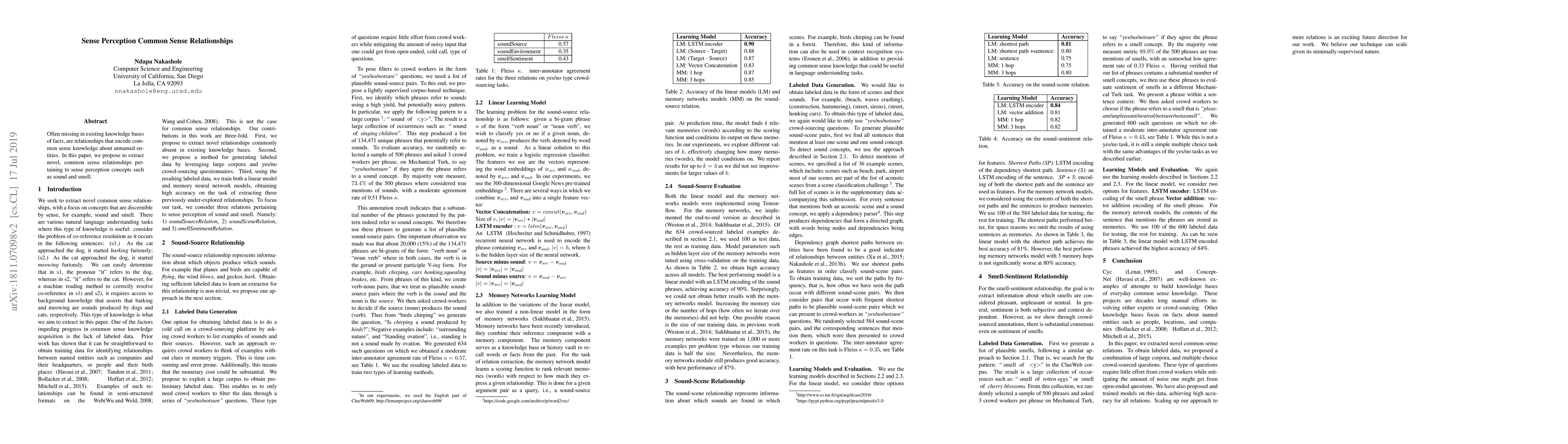 Summary: This paper introduces a method to extract common sense relationships related to sense perception, like sound and smell, which are often absent in existing knowledge bases, aiming to fill this gap with novel insights.