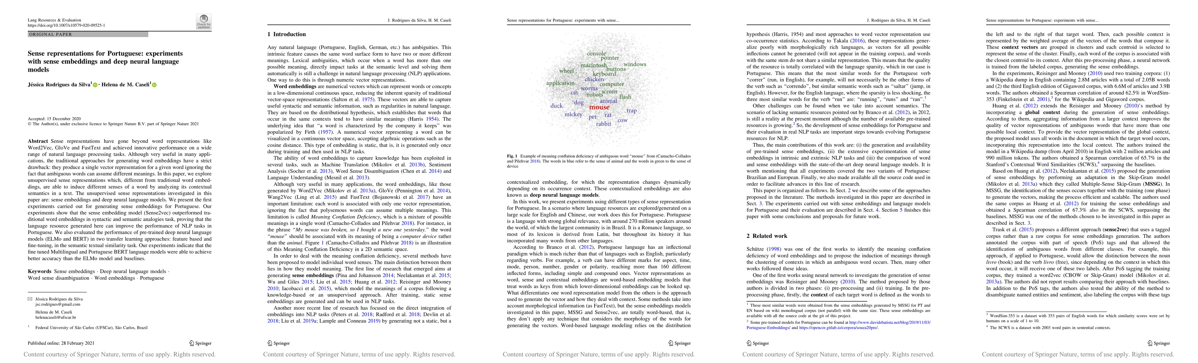 This paper explores unsupervised sense representations for Portuguese, specifically sense embeddings (Sense2vec) and deep neural language models (ELMo and BERT), to better handle word ambiguity. Results show that Sense2vec outperforms traditional embeddings in syntactic and semantic tasks, while fine-tuned BERT models achieve superior accuracy in semantic textual similarity compared to ELMo.