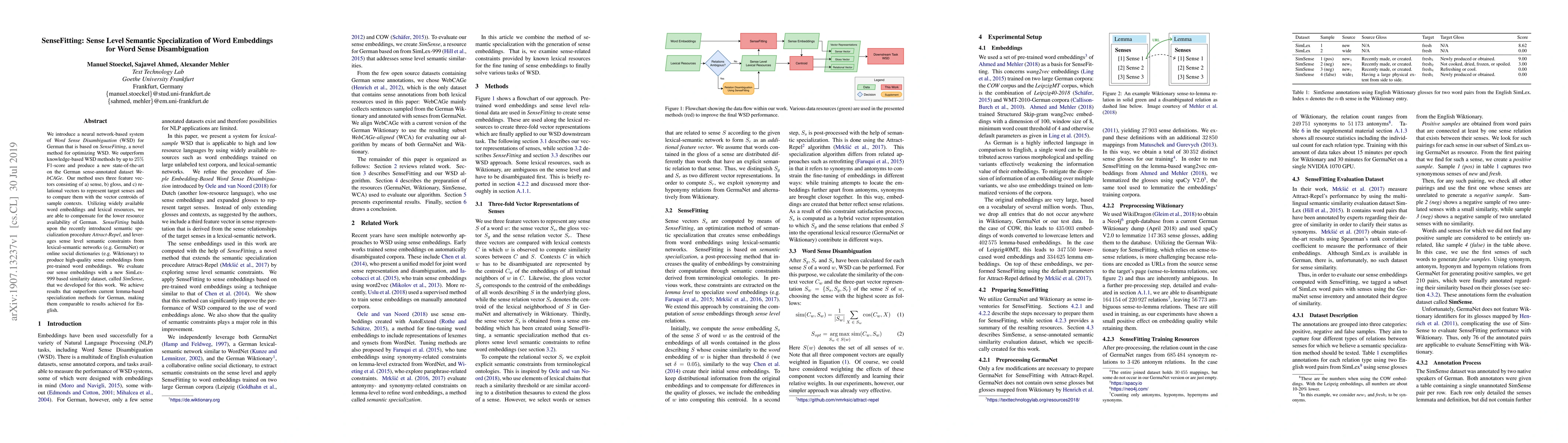 The paper introduces SenseFitting, a neural network system for German Word Sense Disambiguation (WSD) that optimizes sense embeddings using semantic specialization. It achieves state-of-the-art results, outperforming knowledge-based methods by up to 25% in F1-score, leveraging sense, gloss, and relational vectors to enhance sense representation.