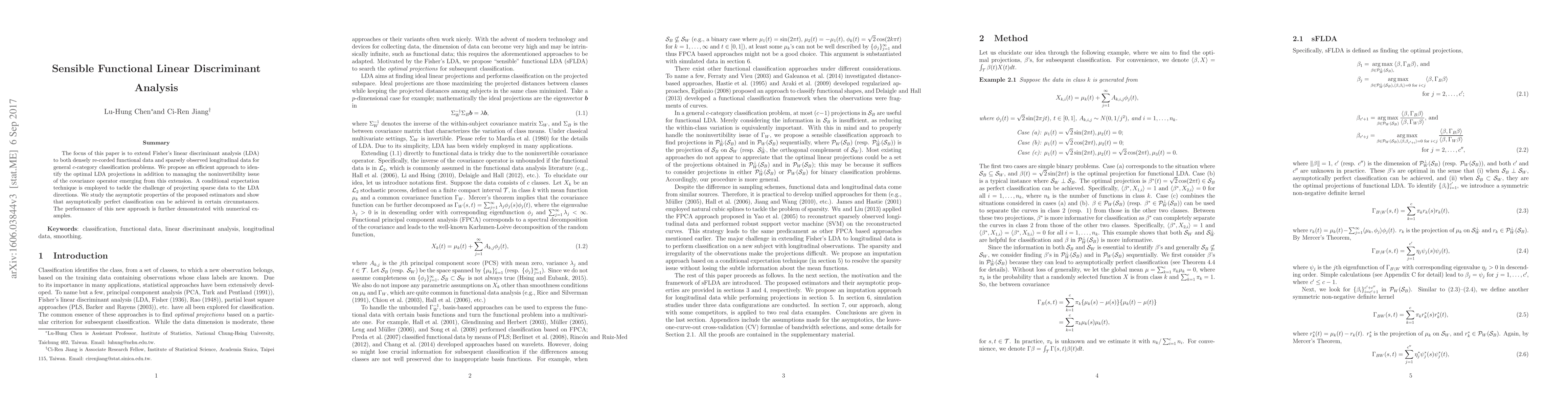 The focus of this paper is to extend Fisher's linear discriminant analysis (LDA) to both densely re-corded functional data and sparsely observed longitudinal data for general $c$-category classification problems. We propose an efficient approach to identify the optimal LDA projections in addition to managing the noninvertibility issue of the covariance operator emerging from this extension. A conditional expectation technique is employed to tackle the challenge of projecting sparse data to the LDA directions. We study the asymptotic properties of the proposed estimators and show that asymptotically perfect classification can be achieved in certain circumstances. The performance of this new approach is further demonstrated with numerical examples.