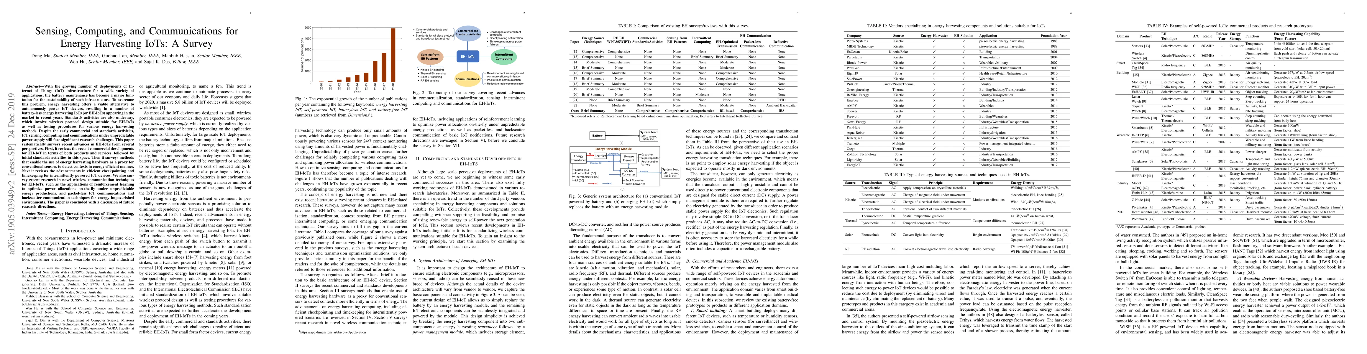 This paper surveys recent advancements in energy harvesting IoT (EH-IoT) devices, covering commercial products, standards activities, energy-efficient context detection, efficient power management, and novel wireless communication techniques. It highlights the need for further research in optimizing power allocation and exploring packet-less, backscatter communication methods for energy-impoverished environments.