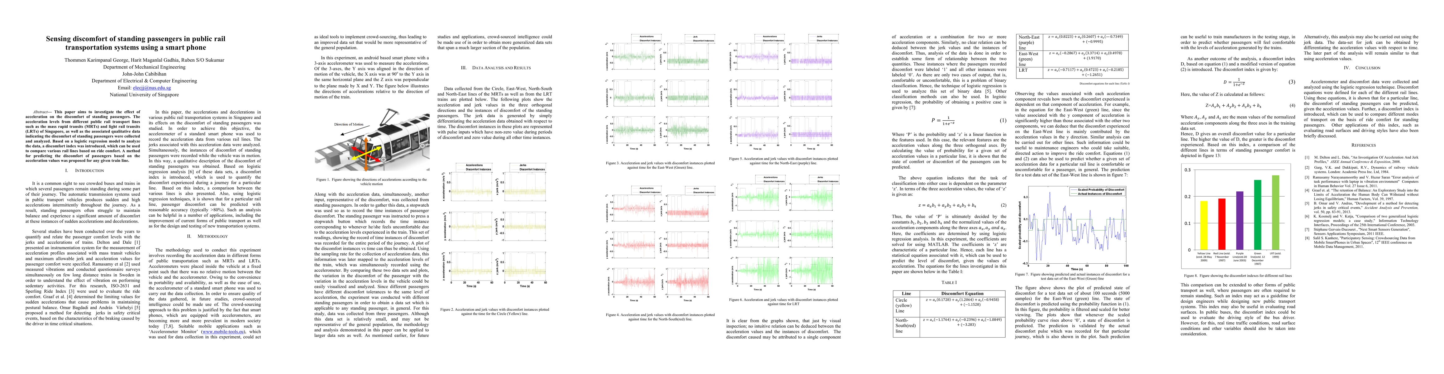 This paper investigates the impact of acceleration on the discomfort of standing passengers in public rail systems, using data from Singapore’s MRTs and LRTs. A logistic regression model was employed to develop a discomfort index for comparing ride comfort across different rail lines, and a predictive method for passenger discomfort based on acceleration values was proposed.