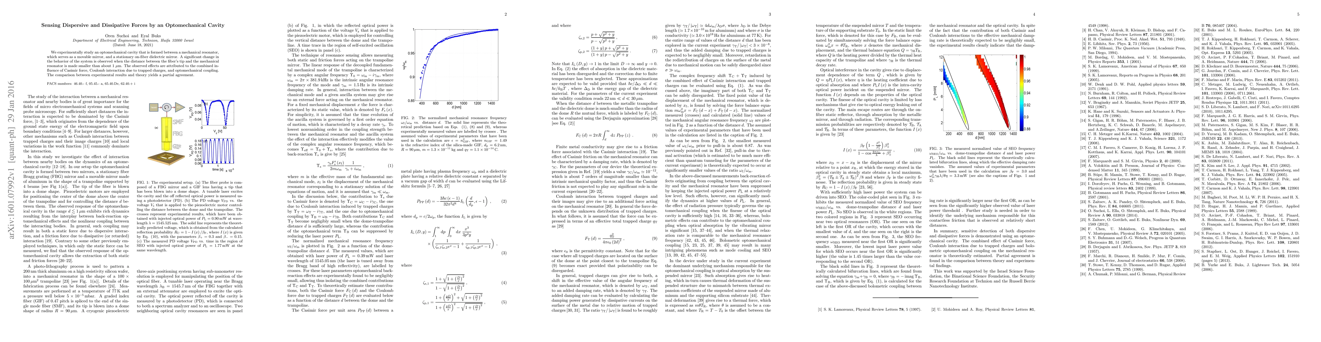 We experimentally study an optomechanical cavity that is formed between a mechanical resonator, which serves as a movable mirror, and a stationary on-fiber dielectric mirror. A significant change in the behavior of the system is observed when the distance between the fiber's tip and the mechanical resonator is made smaller than about 1 micrometer. The observed effects are attributed to the combined influence of Casimir force, Coulomb interaction due to trapped charges, and optomechanical coupling. The comparison between experimental results and theory yields a partial agreement.