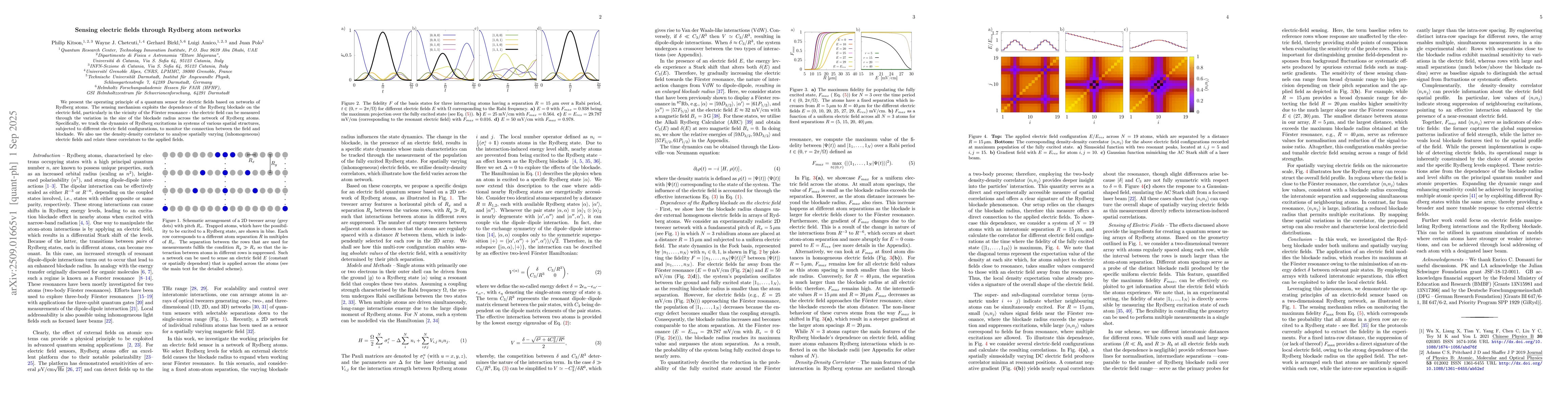 We present the operating principle of a quantum sensor for electric fields based on networks of Rydberg atoms. The sensing mechanism exploits the dependence of the Rydberg blockade on the electric field, particularly in the vicinity of the F\"{o}rster resonance - the electric field can be measured through the variation in the size of the blockade radius across the network of Rydberg atoms. Specifically, we track the dynamics of Rydberg excitations in systems of various spatial structures, subjected to different electric field configurations, to monitor the connection between the field and blockade. We also use the density-density correlator to analyse spatially varying (inhomogeneous) electric fields and relate these correlators to the applied fields.