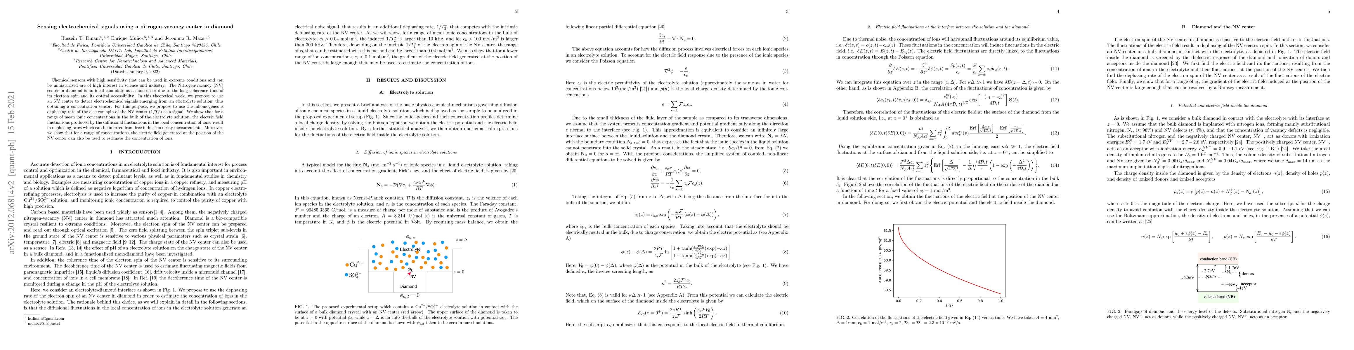 They demonstrate that the inhomogeneous dephasing rate of the NV center's electron spin can be used to detect electrochemical signals, offering a potential solution for chemical sensing applications.